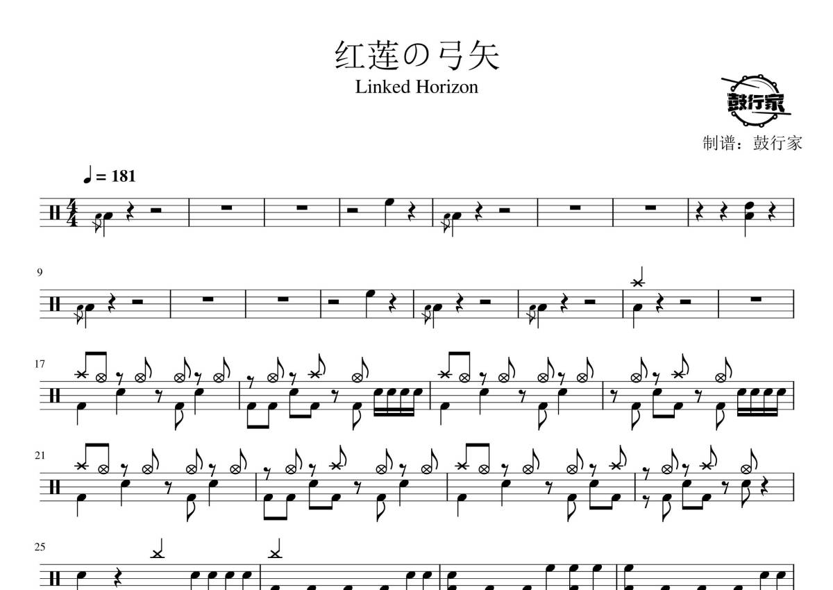 《红莲の弓矢》是Linked Horizon演唱的一首歌曲,拍号为4/4拍,歌曲速度为每分钟181拍,这份鼓谱共有五张高清图谱,图谱由 @鼓行家 编配上传,图谱使用五线谱编配,使用这份红莲の弓矢架子鼓谱,你将能够轻松地敲打出这首Linked Horizon的红莲の弓矢,快来尝试吧。