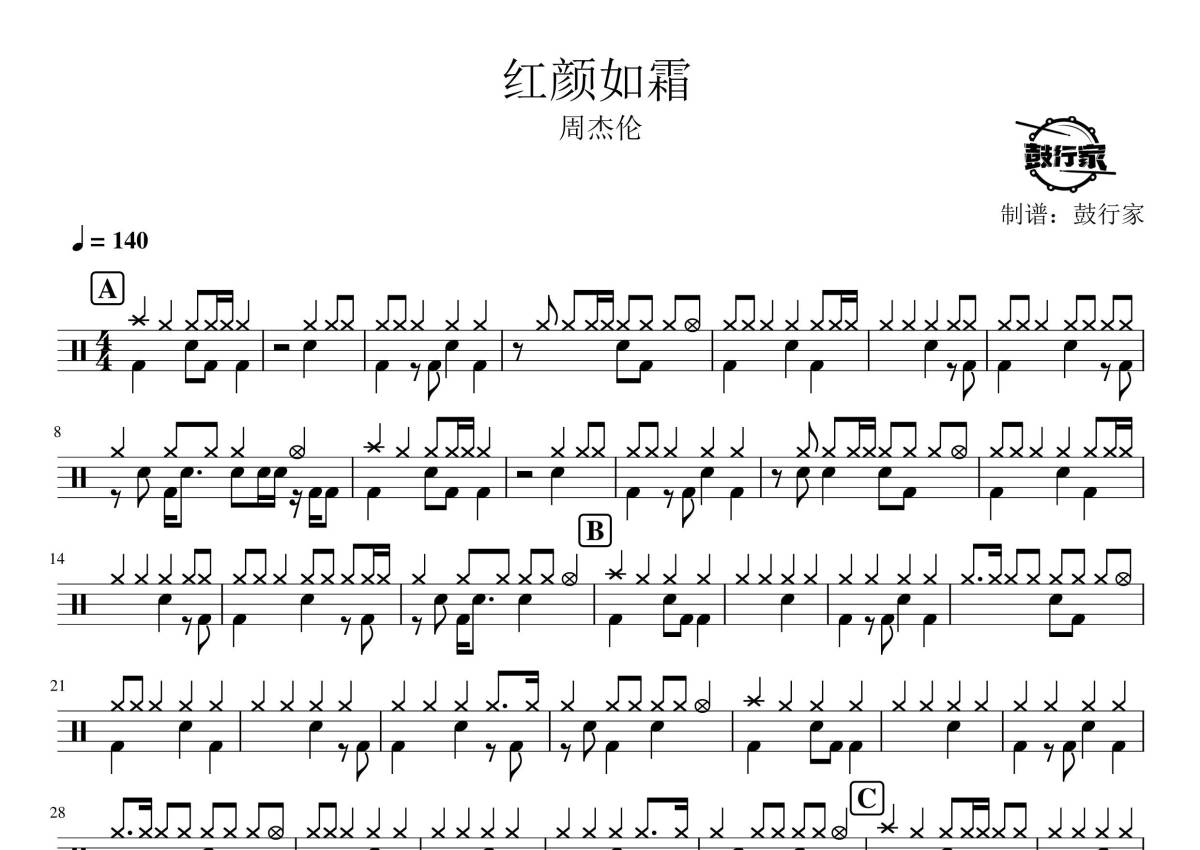 《红颜如霜》是周杰伦演唱的一首歌曲,拍号为4/4拍,歌曲速度为每分钟140拍,这份鼓谱共有两张高清图谱,图谱由 @鼓行家 编配上传,图谱使用五线谱编配,使用这份红颜如霜架子鼓谱,你将能够轻松地敲打出这首周杰伦的红颜如霜,快来尝试吧。