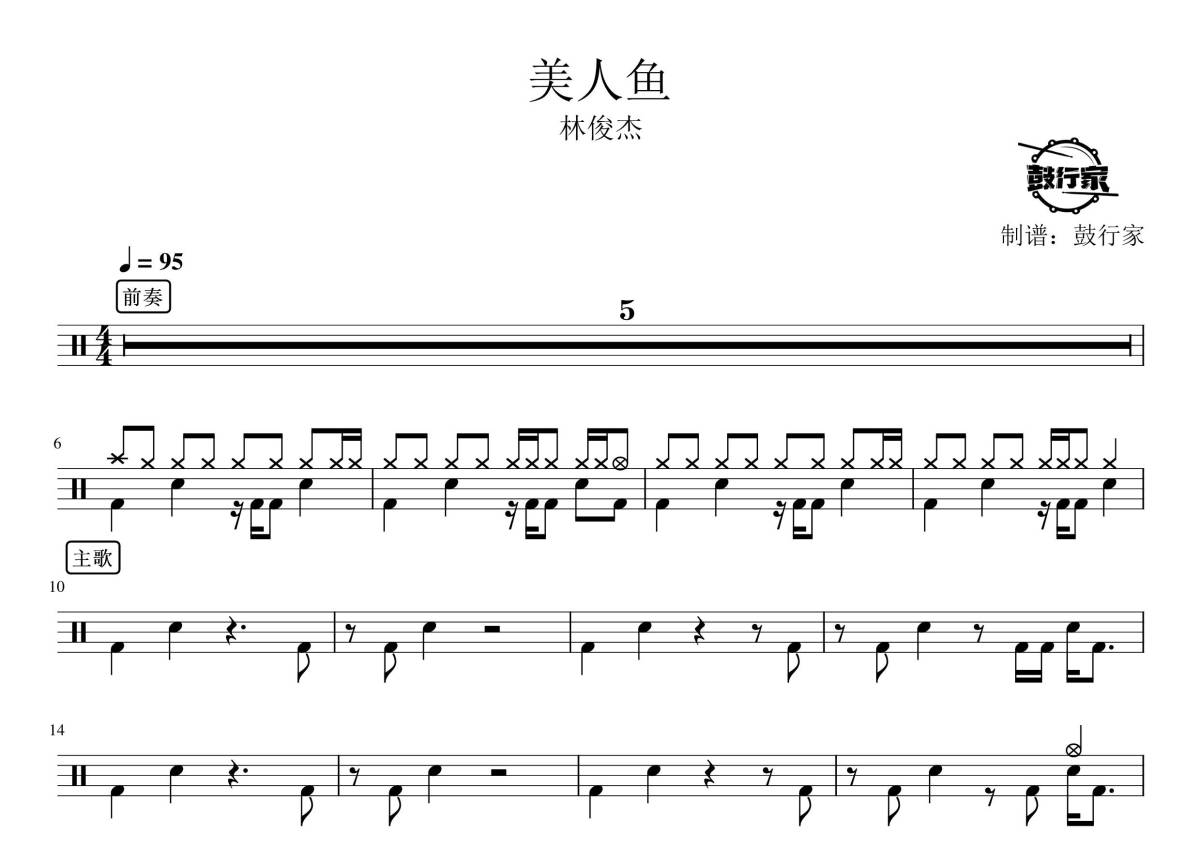 《美人鱼》是林俊杰演唱的一首歌曲,拍号为4/4拍,歌曲速度为每分钟95拍,这份鼓谱共有两张高清图谱,图谱由 @鼓行家 编配上传,图谱使用五线谱编配,使用这份美人鱼架子鼓谱,你将能够轻松地敲打出这首林俊杰的美人鱼,快来尝试吧。