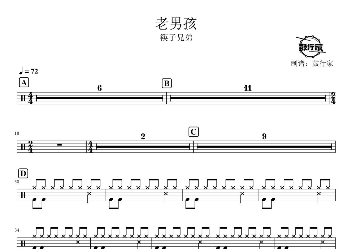 《老男孩》是筷子兄弟演唱的一首歌曲,拍号为4/4拍,歌曲速度为每分钟72拍,这份鼓谱共有两张高清图谱,图谱由 @鼓行家 编配上传,图谱使用五线谱编配,使用这份老男孩架子鼓谱,你将能够轻松地敲打出这首筷子兄弟的老男孩,快来尝试吧。