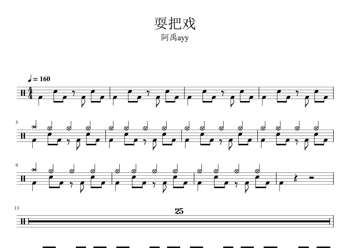 《耍把戏》是阿禹ayy演唱的一首歌曲,拍号为4/4拍,歌曲速度为每分钟160拍,这份鼓谱共有两张高清图谱,图谱由 @鼓行家 编配上传,图谱使用五线谱编配,使用这份耍把戏架子鼓谱,你将能够轻松地敲打出这首阿禹ayy的耍把戏,快来尝试吧。