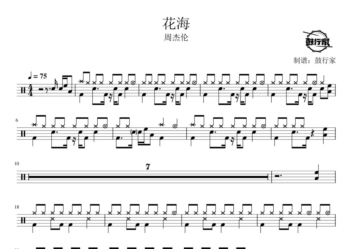 《花海》是周杰伦演唱的一首歌曲,拍号为4/4拍,歌曲速度为每分钟75拍,这份鼓谱共有两张高清图谱,图谱由 @鼓行家 编配上传,图谱使用五线谱编配,使用这份花海架子鼓谱,你将能够轻松地敲打出这首周杰伦的花海,快来尝试吧。