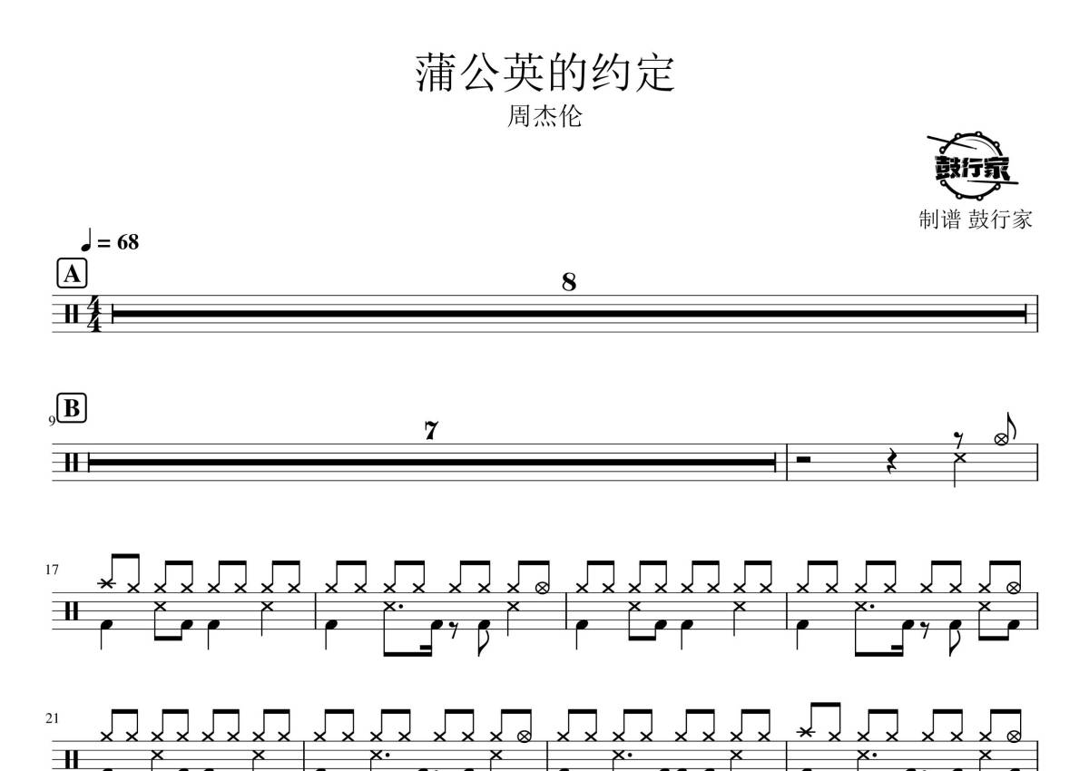 《蒲公英的约定》是周杰伦演唱的一首歌曲,拍号为4/4拍,歌曲速度为每分钟68拍,这份鼓谱共有两张高清图谱,图谱由 @鼓行家 编配上传,图谱使用五线谱编配,使用这份蒲公英的约定架子鼓谱,你将能够轻松地敲打出这首周杰伦的蒲公英的约定,快来尝试吧。
