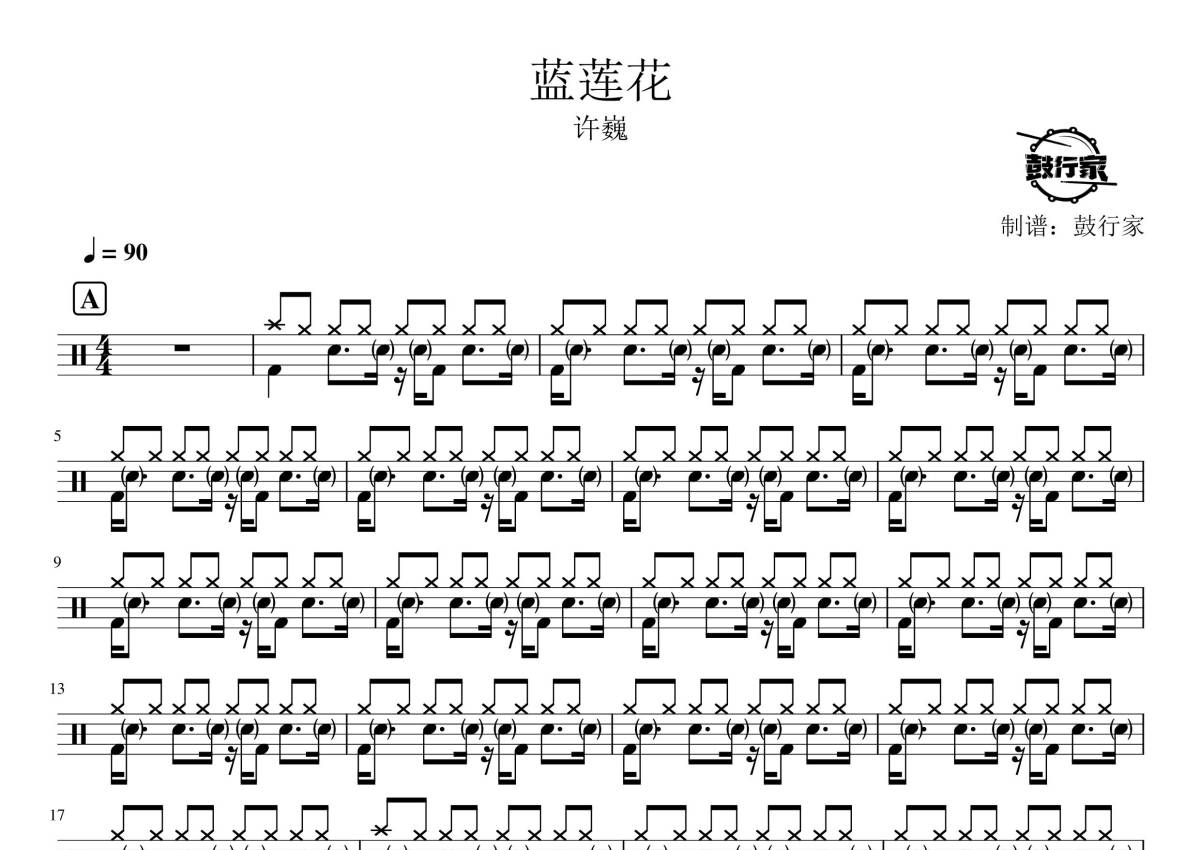 《蓝莲花》是许巍演唱的一首歌曲,拍号为4/4拍,歌曲速度为每分钟90拍,这份鼓谱共有两张高清图谱,图谱由 @鼓行家 编配上传,图谱使用五线谱编配,使用这份蓝莲花架子鼓谱,你将能够轻松地敲打出这首许巍的蓝莲花,快来尝试吧。