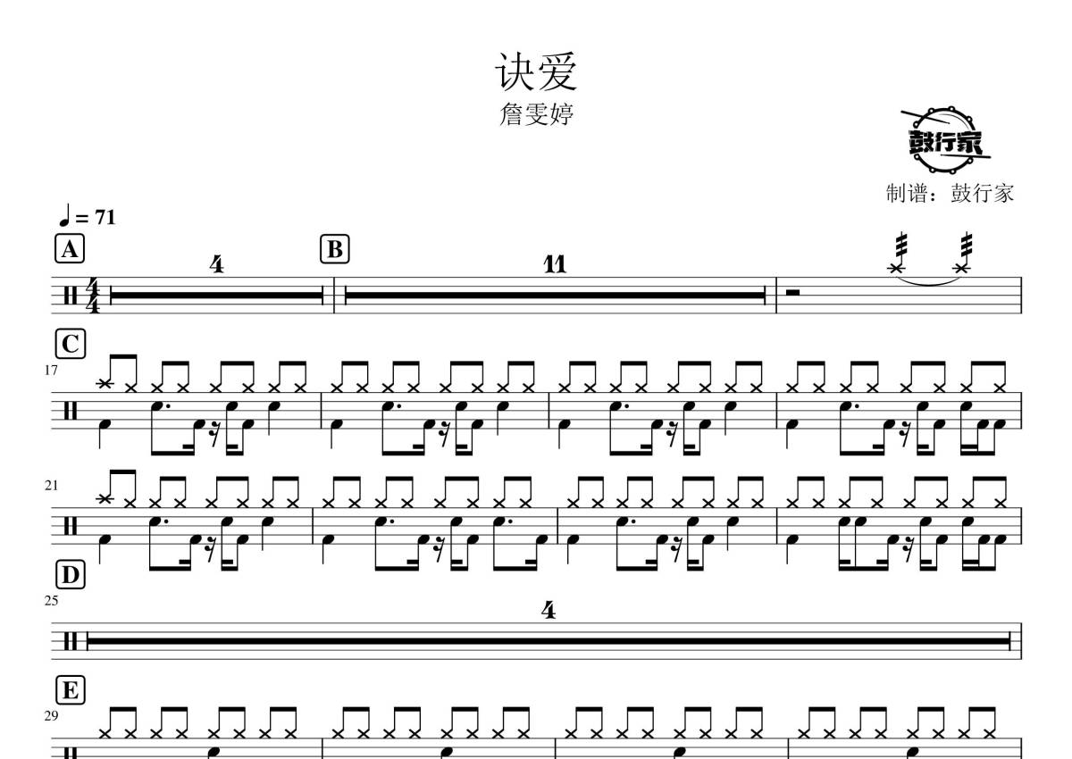 《诀爱》是詹雯婷演唱的一首歌曲,拍号为4/4拍,歌曲速度为每分钟71拍,这份鼓谱共有一张高清图谱,图谱由 @鼓行家 编配上传,图谱使用五线谱编配,使用这份诀爱架子鼓谱,你将能够轻松地敲打出这首詹雯婷的诀爱,快来尝试吧。