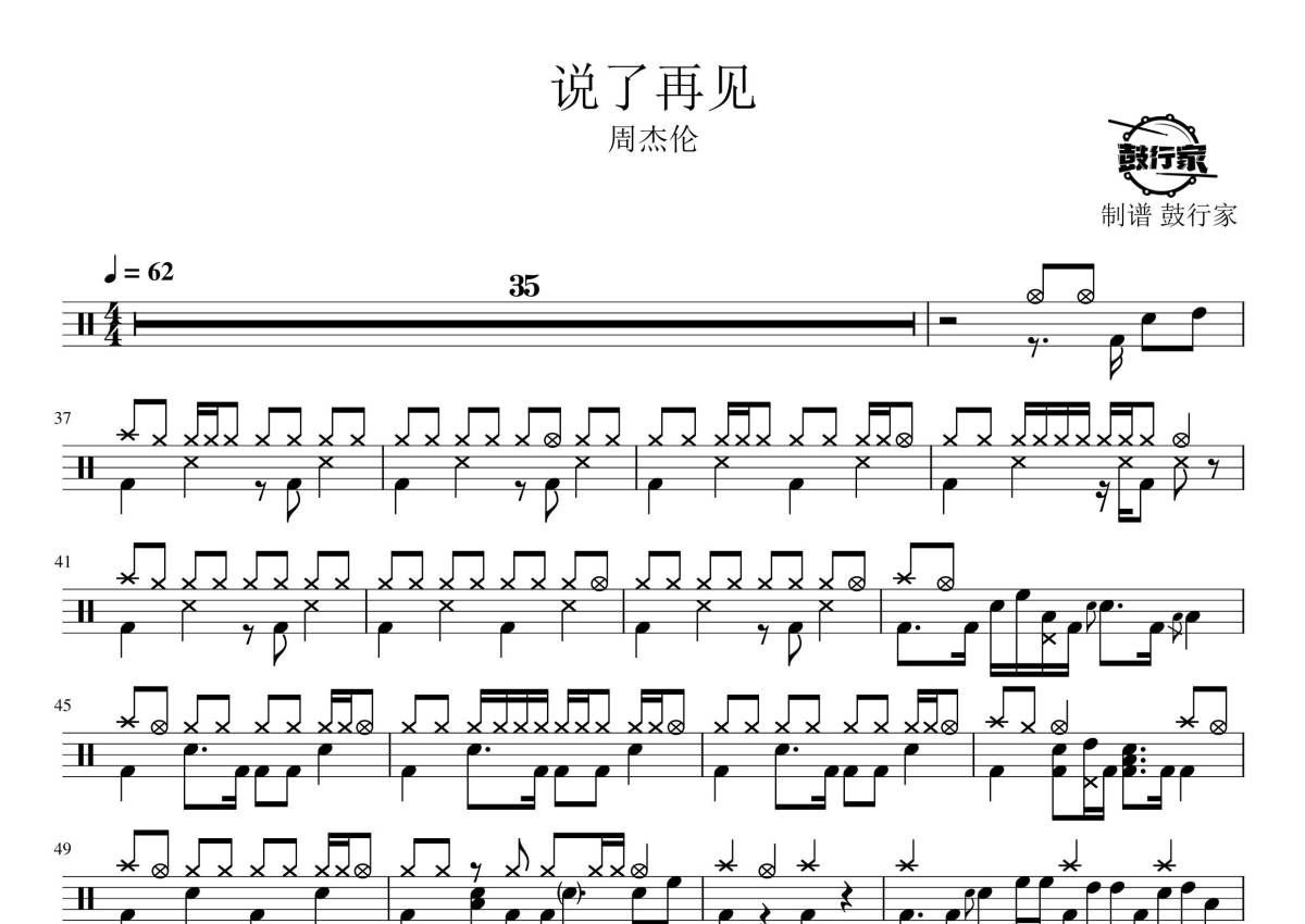 《说了再见》是周杰伦演唱的一首歌曲,拍号为4/4拍,歌曲速度为每分钟62拍,这份鼓谱共有一张高清图谱,图谱由 @鼓行家 编配上传,图谱使用五线谱编配,使用这份说了再见架子鼓谱,你将能够轻松地敲打出这首周杰伦的说了再见,快来尝试吧。