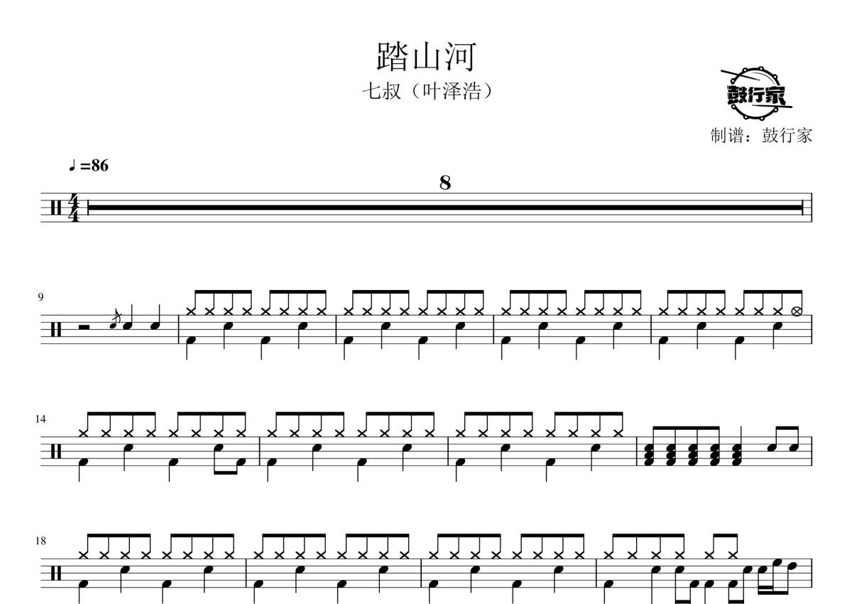 《踏山河》是是七叔呀演唱的一首歌曲,拍号为4/4拍,歌曲速度为每分钟86拍,这份鼓谱共有两张高清图谱,图谱由 @鼓行家 编配上传,图谱使用五线谱编配,使用这份踏山河架子鼓谱,你将能够轻松地敲打出这首是七叔呀的踏山河,快来尝试吧。