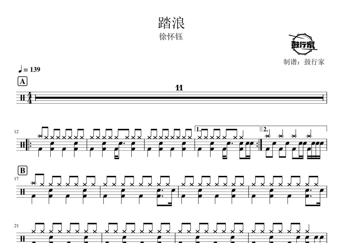 《踏浪》是徐怀钰演唱的一首歌曲,拍号为4/4拍,歌曲速度为每分钟139拍,这份鼓谱共有三张高清图谱,图谱由 @鼓行家 编配上传,图谱使用五线谱编配,使用这份踏浪架子鼓谱,你将能够轻松地敲打出这首徐怀钰的踏浪,快来尝试吧。