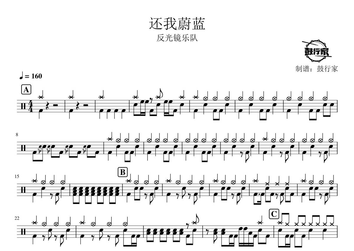 《还我蔚蓝》是反光镜乐队演唱的一首歌曲,拍号为4/4拍,歌曲速度为每分钟160拍,这份鼓谱共有两张高清图谱,图谱由 @鼓行家 编配上传,图谱使用五线谱编配,使用这份还我蔚蓝架子鼓谱,你将能够轻松地敲打出这首反光镜乐队的还我蔚蓝,快来尝试吧。