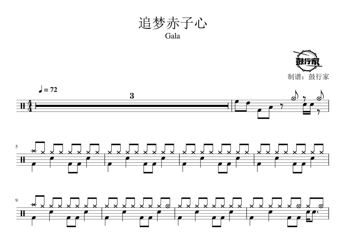 《追梦赤子心》是GALA演唱的一首歌曲,拍号为4/4拍,歌曲速度为每分钟72拍,这份鼓谱共有三张高清图谱,图谱由 @鼓行家 编配上传,图谱使用五线谱编配,使用这份追梦赤子心架子鼓谱,你将能够轻松地敲打出这首GALA的追梦赤子心,快来尝试吧。