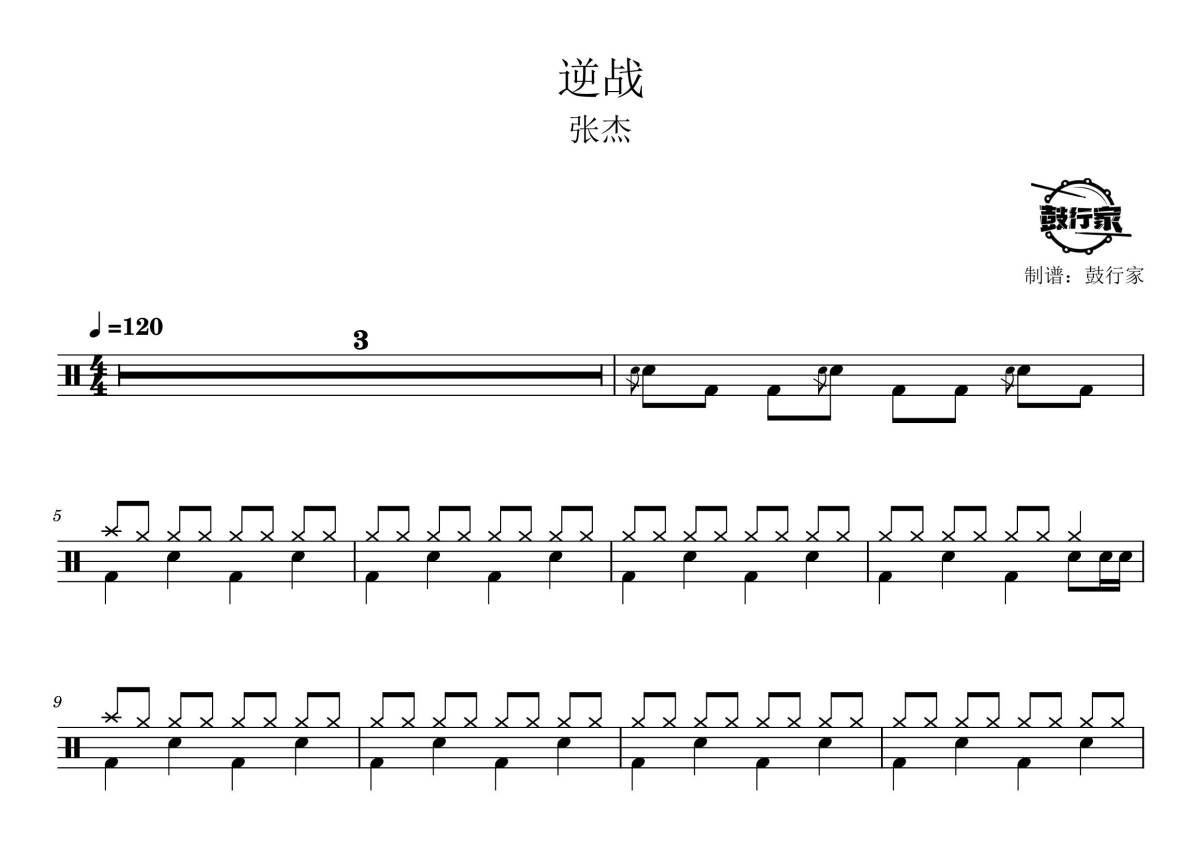 《逆战》是张杰演唱的一首歌曲,拍号为4/4拍,歌曲速度为每分钟120拍,这份鼓谱共有三张高清图谱,图谱由 @鼓行家 编配上传,图谱使用五线谱编配,使用这份逆战架子鼓谱,你将能够轻松地敲打出这首张杰的逆战,快来尝试吧。