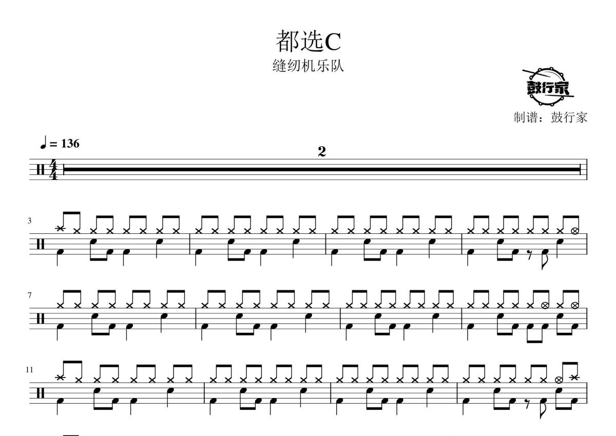《都选C》是缝纫机乐队演唱的一首歌曲,拍号为4/4拍,歌曲速度为每分钟136拍,这份鼓谱共有三张高清图谱,图谱由 @鼓行家 编配上传,图谱使用五线谱编配,使用这份都选C架子鼓谱,你将能够轻松地敲打出这首缝纫机乐队的都选C,快来尝试吧。