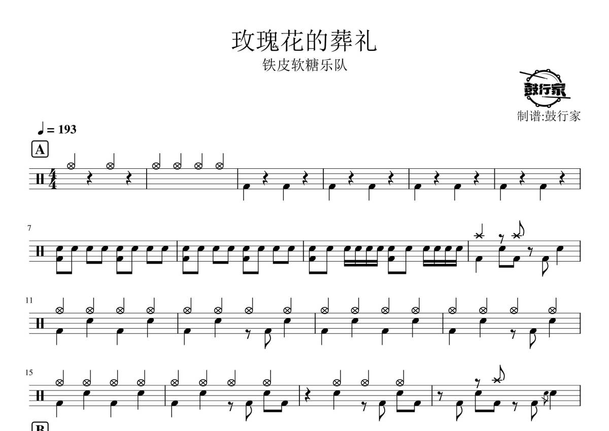 《铁皮玫瑰花的葬礼》是铁皮软糖乐队演唱的一首歌曲,拍号为4/4拍,歌曲速度为每分钟193拍,这份鼓谱共有三张高清图谱,图谱由 @鼓行家 编配上传,图谱使用五线谱编配,使用这份铁皮玫瑰花的葬礼架子鼓谱,你将能够轻松地敲打出这首铁皮软糖乐队的铁皮玫瑰花的葬礼,快来尝试吧。