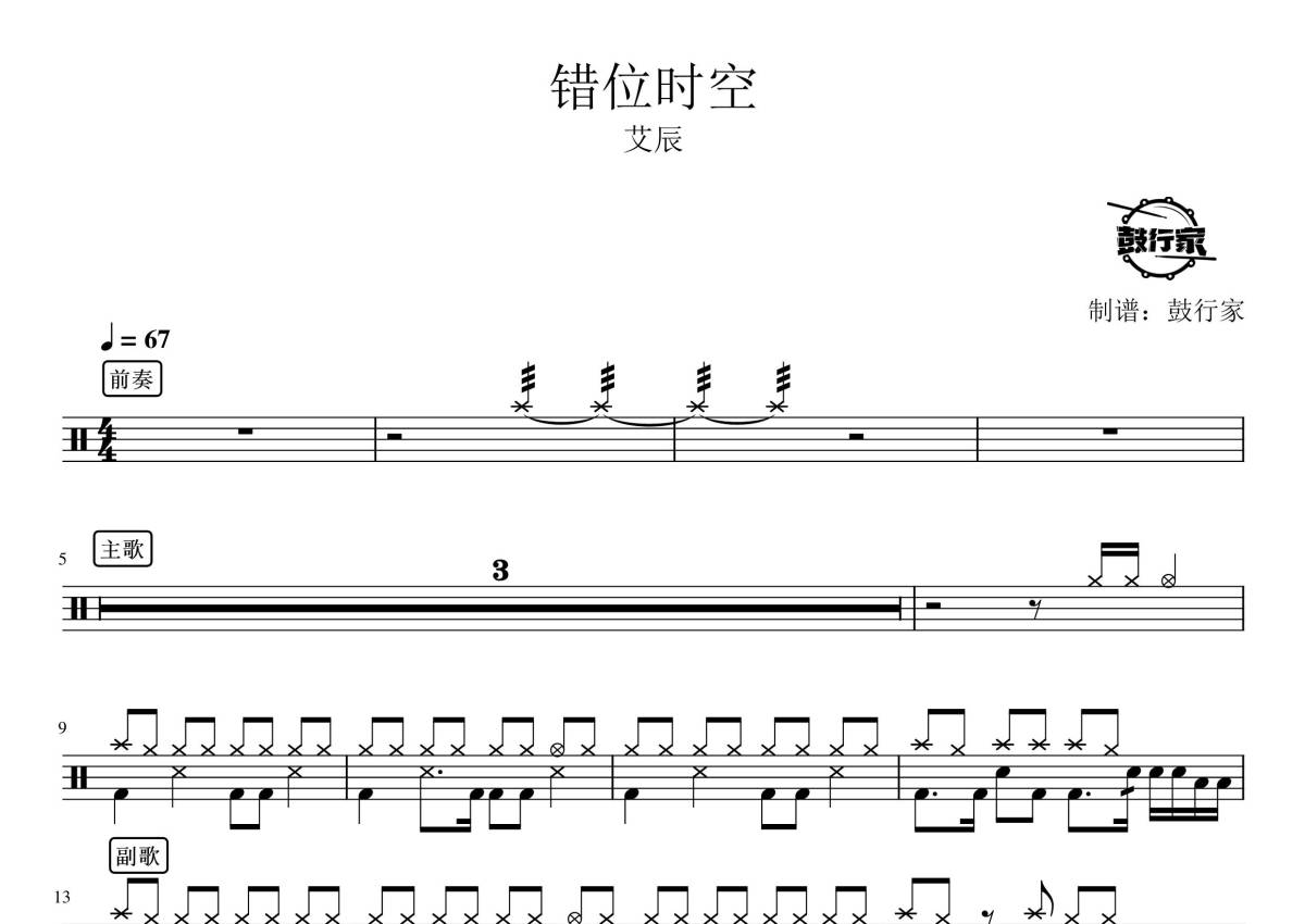《错位时空》是艾辰演唱的一首歌曲,拍号为4/4拍,歌曲速度为每分钟67拍,这份鼓谱共有两张高清图谱,图谱由 @鼓行家 编配上传,图谱使用五线谱编配,使用这份错位时空架子鼓谱,你将能够轻松地敲打出这首艾辰的错位时空,快来尝试吧。