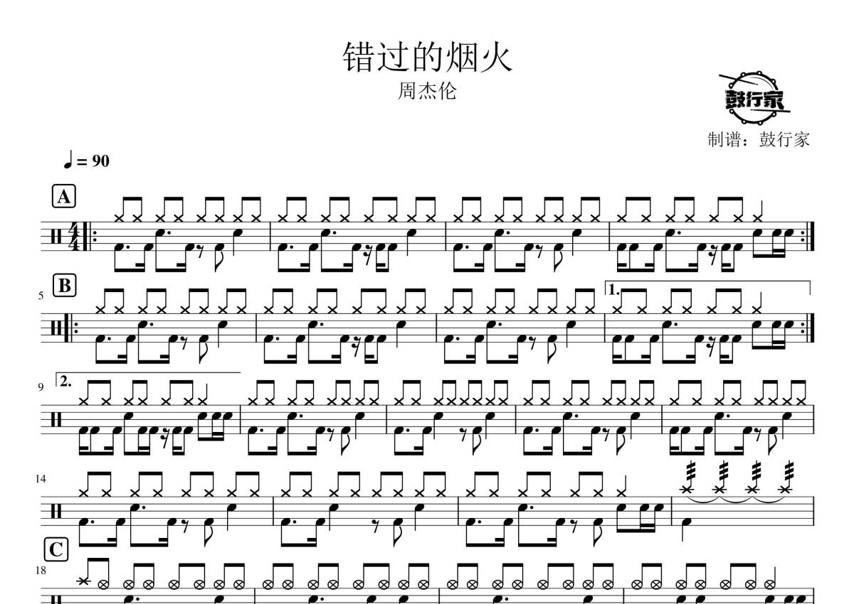 《错过的烟火》是周杰伦演唱的一首歌曲,拍号为4/4拍,歌曲速度为每分钟90拍,这份鼓谱共有两张高清图谱,图谱由 @鼓行家 编配上传,图谱使用五线谱编配,使用这份错过的烟火架子鼓谱,你将能够轻松地敲打出这首周杰伦的错过的烟火,快来尝试吧。