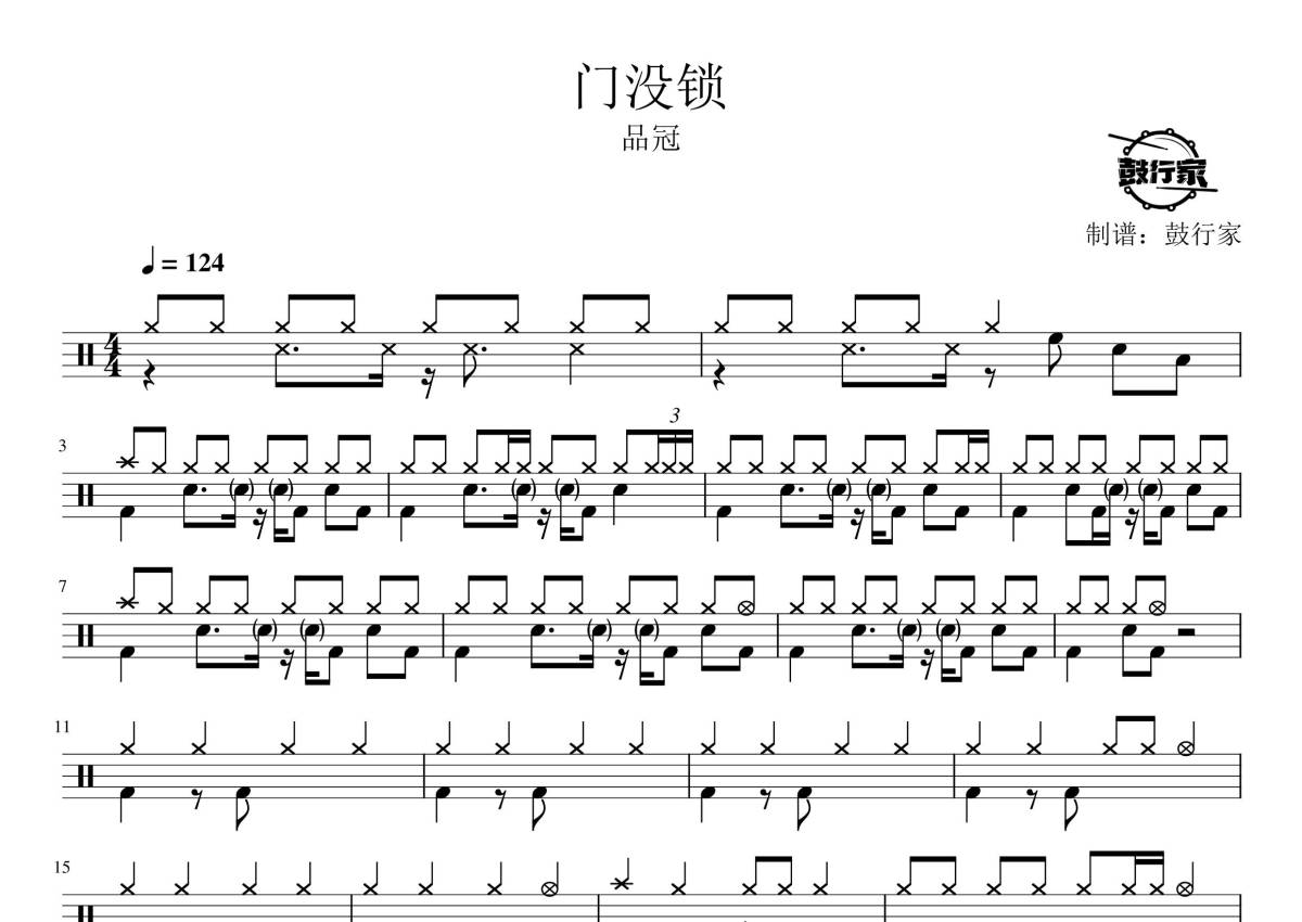《门没锁》是品冠演唱的一首歌曲,拍号为4/4拍,歌曲速度为每分钟124拍,这份鼓谱共有三张高清图谱,图谱由 @鼓行家 编配上传,图谱使用五线谱编配,使用这份门没锁架子鼓谱,你将能够轻松地敲打出这首品冠的门没锁,快来尝试吧。