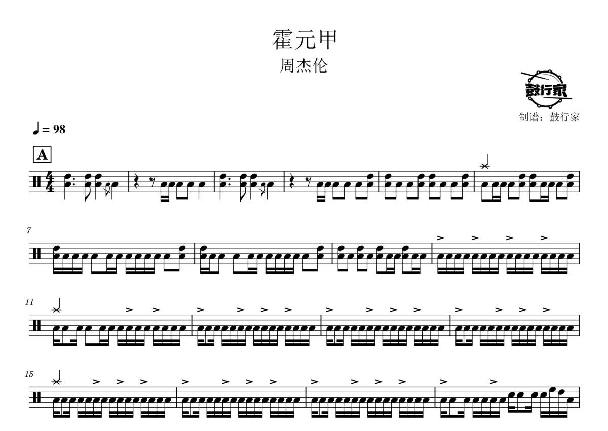 《霍元甲》是周杰伦演唱的一首歌曲,拍号为4/4拍,歌曲速度为每分钟98拍,这份鼓谱共有三张高清图谱,图谱由 @鼓行家 编配上传,图谱使用五线谱编配,使用这份霍元甲架子鼓谱,你将能够轻松地敲打出这首周杰伦的霍元甲,快来尝试吧。