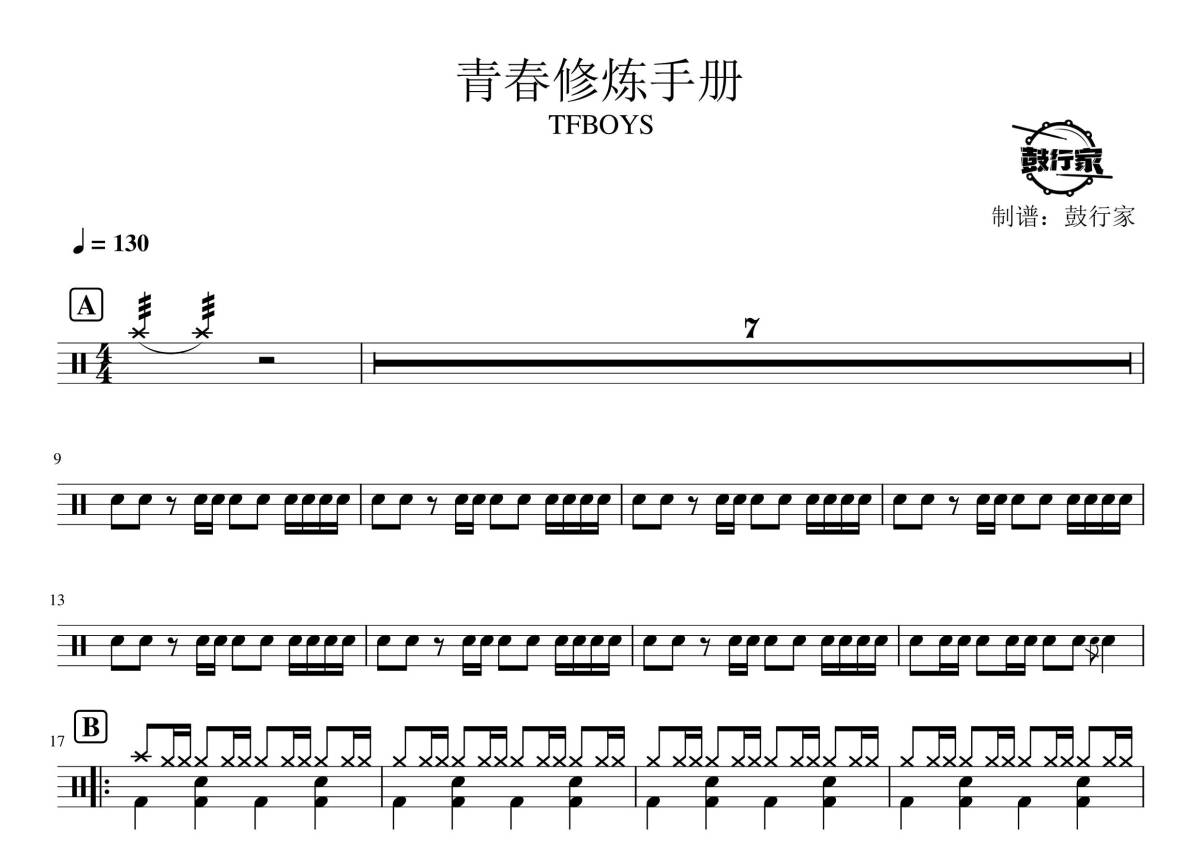 《青春修炼手册》是TFBOYS演唱的一首歌曲,拍号为4/4拍,歌曲速度为每分钟130拍,这份鼓谱共有两张高清图谱,图谱由 @鼓行家 编配上传,图谱使用五线谱编配,使用这份青春修炼手册架子鼓谱,你将能够轻松地敲打出这首TFBOYS的青春修炼手册,快来尝试吧。