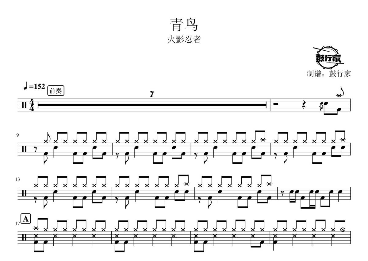 《青鸟》是火影忍者插曲演唱的一首歌曲,拍号为4/4拍,歌曲速度为每分钟152拍,这份鼓谱共有三张高清图谱,图谱由 @鼓行家 编配上传,图谱使用五线谱编配,使用这份青鸟架子鼓谱,你将能够轻松地敲打出这首火影忍者插曲的青鸟,快来尝试吧。
