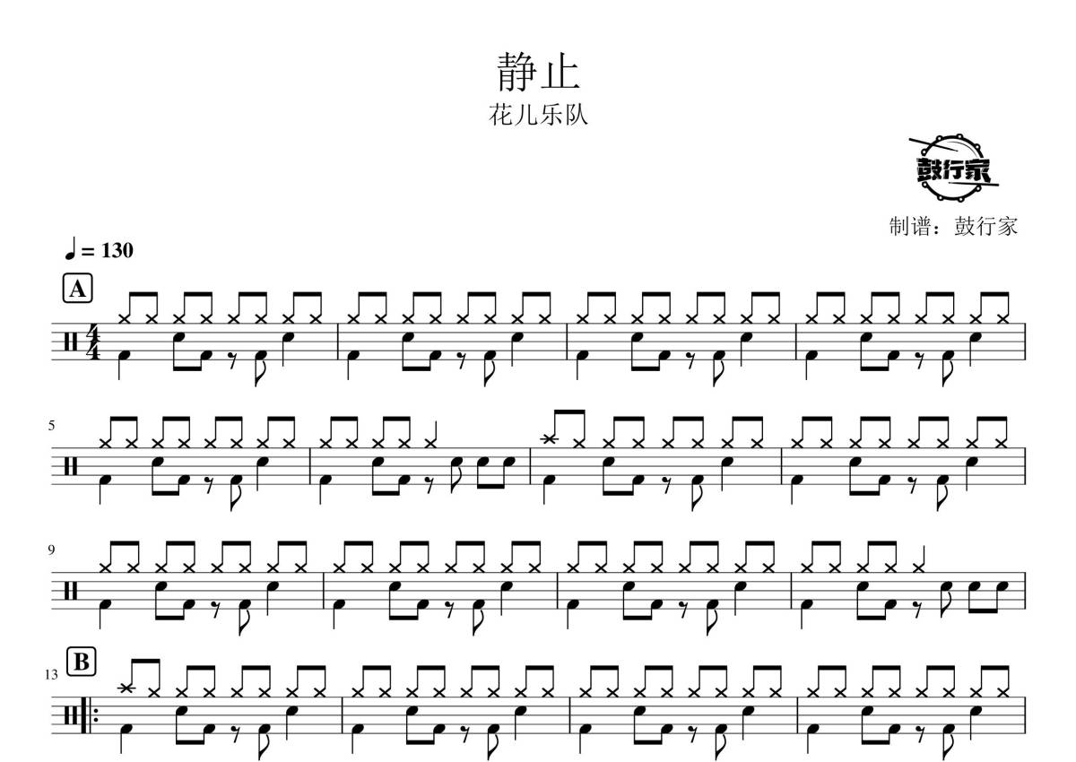 《静止》是花儿乐队演唱的一首歌曲,拍号为4/4拍,歌曲速度为每分钟130拍,这份鼓谱共有两张高清图谱,图谱由 @鼓行家 编配上传,图谱使用五线谱编配,使用这份静止架子鼓谱,你将能够轻松地敲打出这首花儿乐队的静止,快来尝试吧。