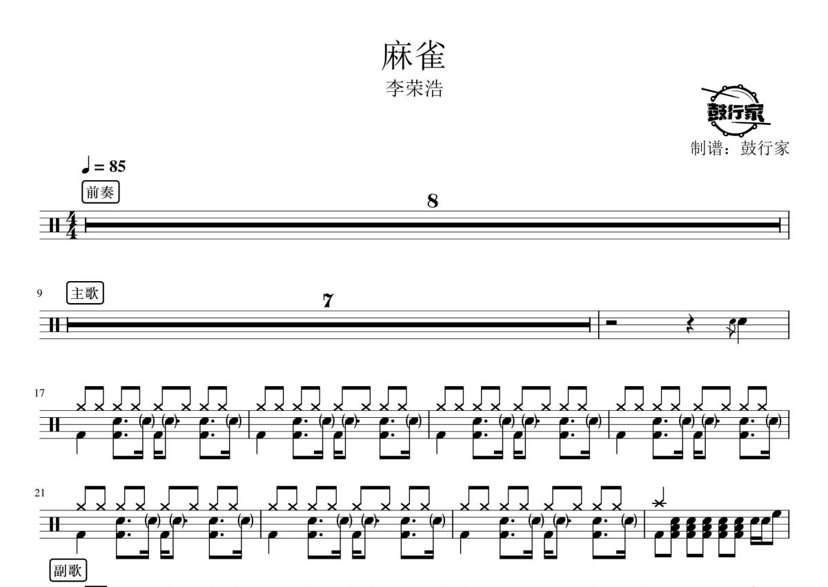《麻雀》是李荣浩演唱的一首歌曲,拍号为4/4拍,歌曲速度为每分钟85拍,这份鼓谱共有两张高清图谱,图谱由 @鼓行家 编配上传,图谱使用五线谱编配,使用这份麻雀架子鼓谱,你将能够轻松地敲打出这首李荣浩的麻雀,快来尝试吧。