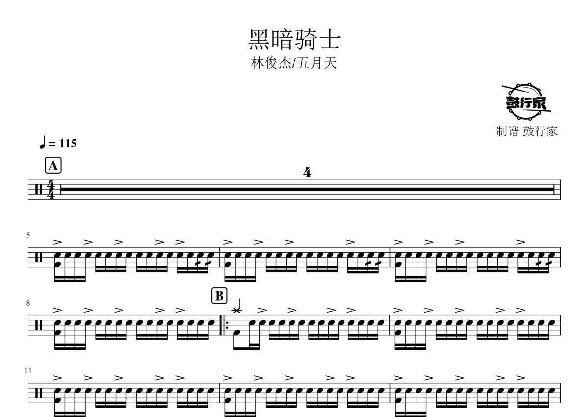 《黑暗骑士》是五月天/林俊杰演唱的一首歌曲,拍号为4/4拍,歌曲速度为每分钟115拍,这份鼓谱共有三张高清图谱,图谱由 @鼓行家 编配上传,图谱使用五线谱编配,使用这份黑暗骑士架子鼓谱,你将能够轻松地敲打出这首五月天/林俊杰的黑暗骑士,快来尝试吧。