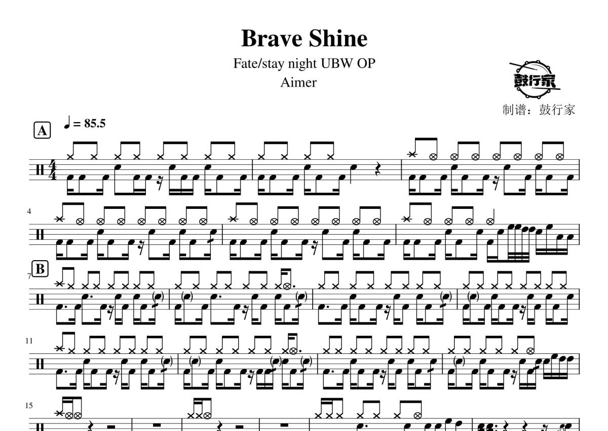 《Brave Shine》是Aimer演唱的一首歌曲,拍号为4/4拍,歌曲速度为每分钟85拍,这份鼓谱共有两张高清图谱,图谱由 @鼓行家 编配上传,图谱使用五线谱编配,使用这份Brave Shine架子鼓谱,你将能够轻松地敲打出这首Aimer的Brave Shine,快来尝试吧。