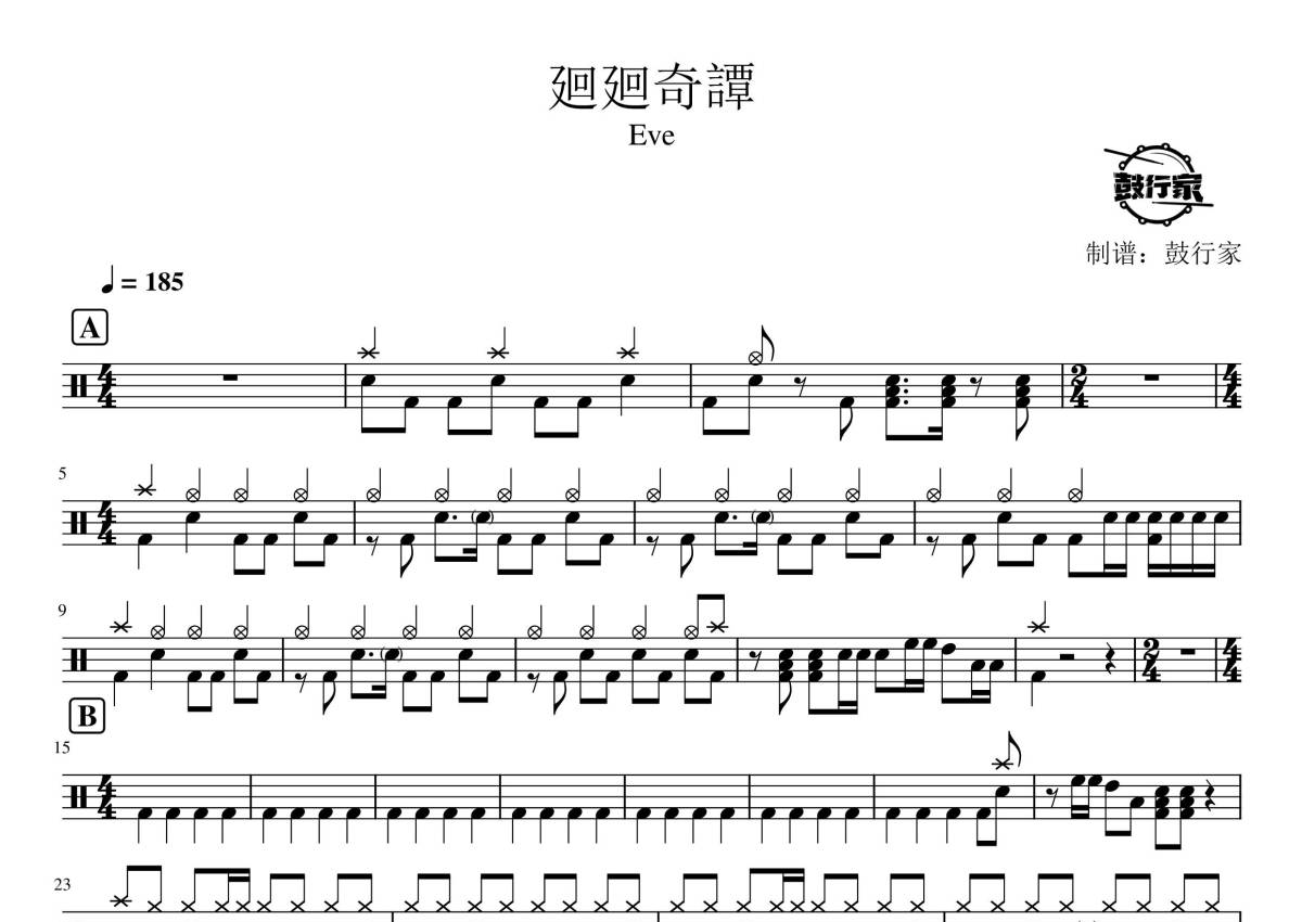 《迥迥奇谭》是Eve演唱的一首歌曲,拍号为4/4拍,歌曲速度为每分钟185拍,这份鼓谱共有三张高清图谱,图谱由 @鼓行家 编配上传,图谱使用五线谱编配,使用这份迥迥奇谭架子鼓谱,你将能够轻松地敲打出这首Eve的迥迥奇谭,快来尝试吧。