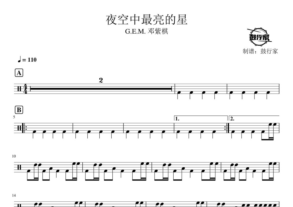 G.E.M. 邓紫棋《夜空中最亮的星》鼓谱 - 架子鼓谱
