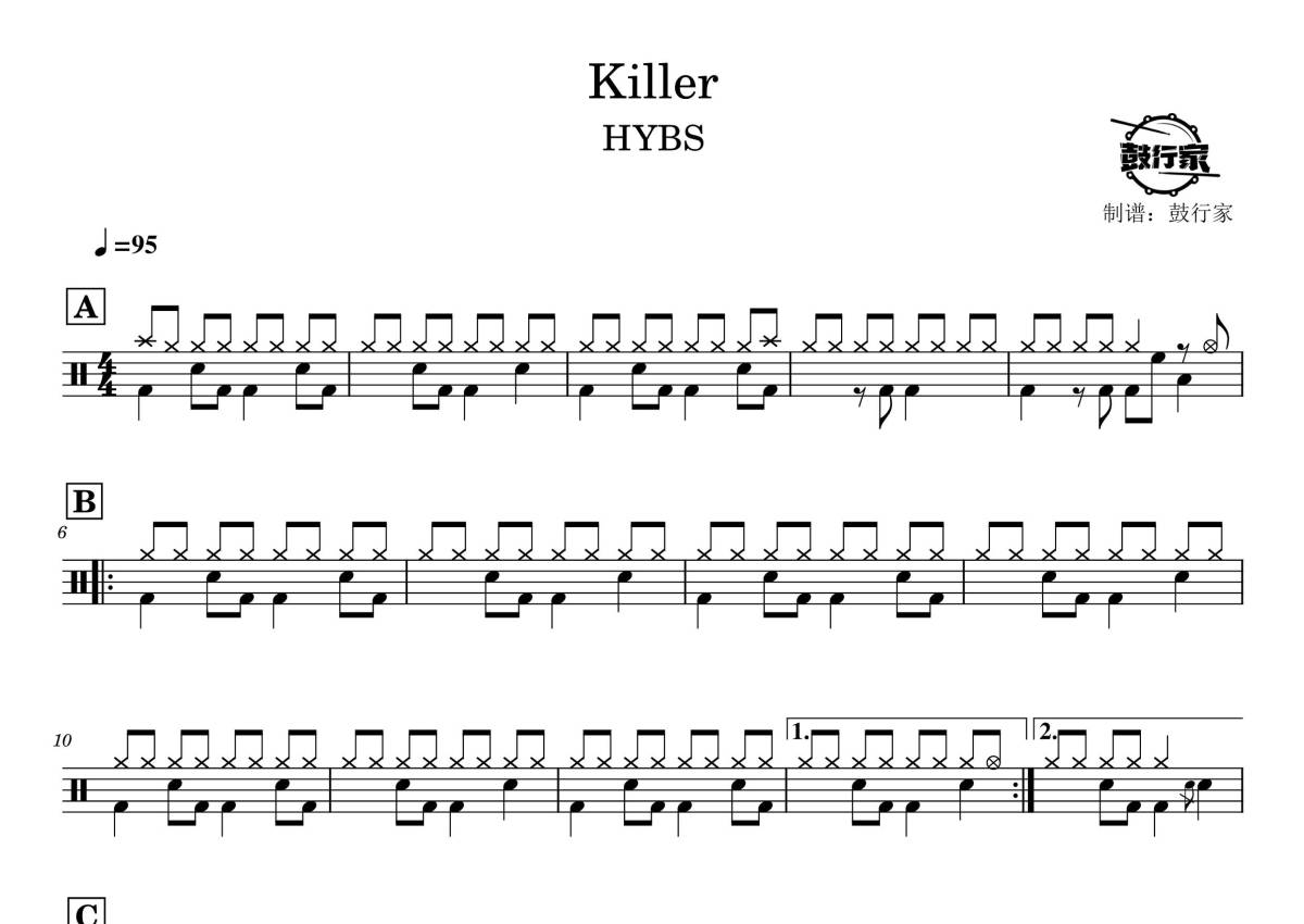 《Killer》是HYBS演唱的一首歌曲,拍号为4/4拍,歌曲速度为每分钟95拍,这份鼓谱共有两张高清图谱,图谱由 @鼓行家 编配上传,图谱使用五线谱编配,使用这份Killer架子鼓谱,你将能够轻松地敲打出这首HYBS的Killer,快来尝试吧。