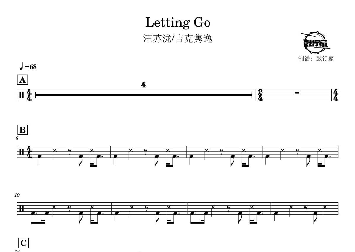 《Letting Go》是汪苏泷/吉克隽逸演唱的一首歌曲,拍号为4/4拍,歌曲速度为每分钟68拍,这份鼓谱共有两张高清图谱,图谱由 @鼓行家 编配上传,图谱使用五线谱编配,使用这份Letting Go架子鼓谱,你将能够轻松地敲打出这首汪苏泷/吉克隽逸的Letting Go,快来尝试吧。