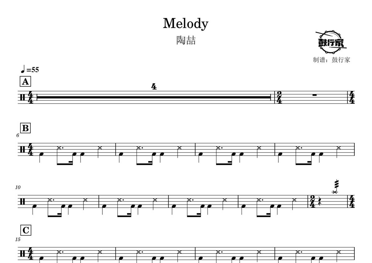 《Melody》是陶喆演唱的一首歌曲,拍号为4/4拍,歌曲速度为每分钟55拍,这份鼓谱共有两张高清图谱,图谱由 @鼓行家 编配上传,图谱使用五线谱编配,使用这份Melody架子鼓谱,你将能够轻松地敲打出这首陶喆的Melody,快来尝试吧。