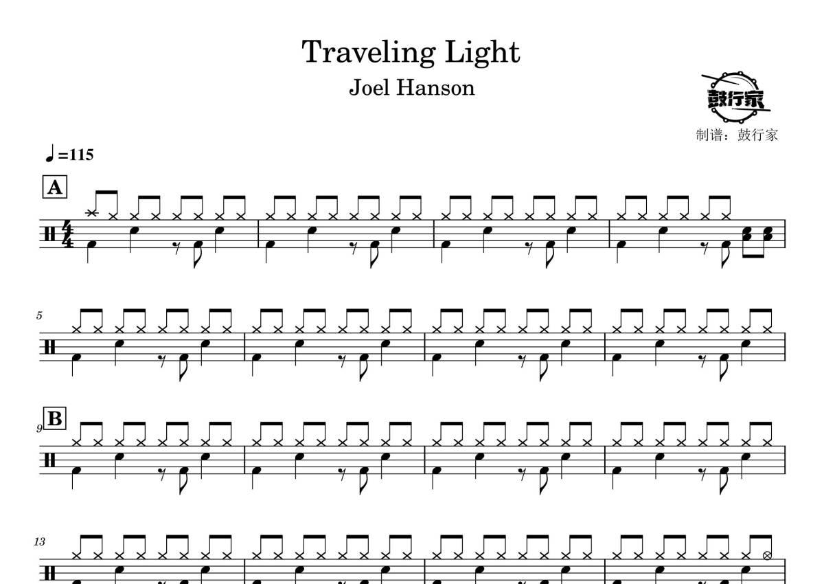 《Traveling Light》是Joel Hanson演唱的一首歌曲,拍号为4/4拍,歌曲速度为每分钟115拍,这份鼓谱共有三张高清图谱,图谱由 @鼓行家 编配上传,图谱使用五线谱编配,使用这份Traveling Light架子鼓谱,你将能够轻松地敲打出这首Joel Hanson的Traveling Light,快来尝试吧。