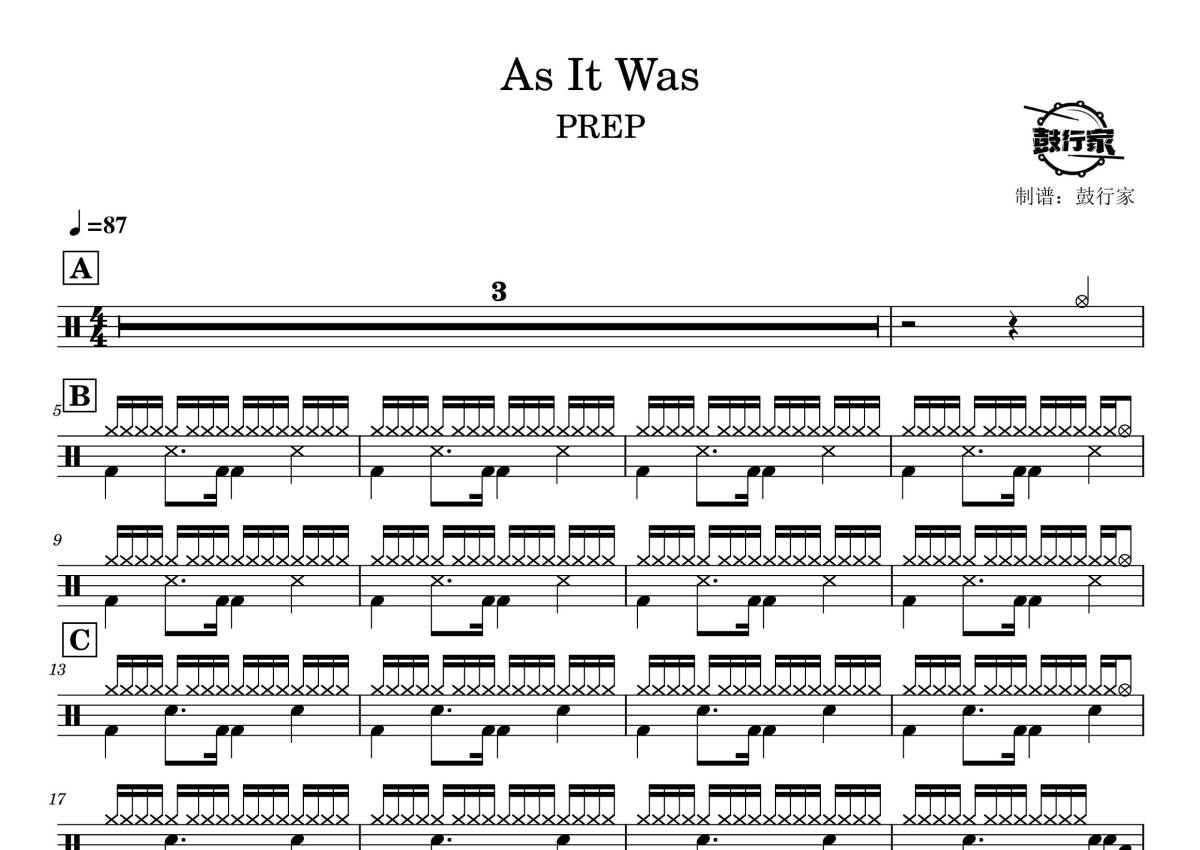 《as it was》是PREP演唱的一首歌曲,拍号为4/4拍,歌曲速度为每分钟87拍,这份鼓谱共有两张高清图谱,图谱由 @鼓行家 编配上传,图谱使用五线谱编配,使用这份as it was架子鼓谱,你将能够轻松地敲打出这首PREP的as it was,快来尝试吧。