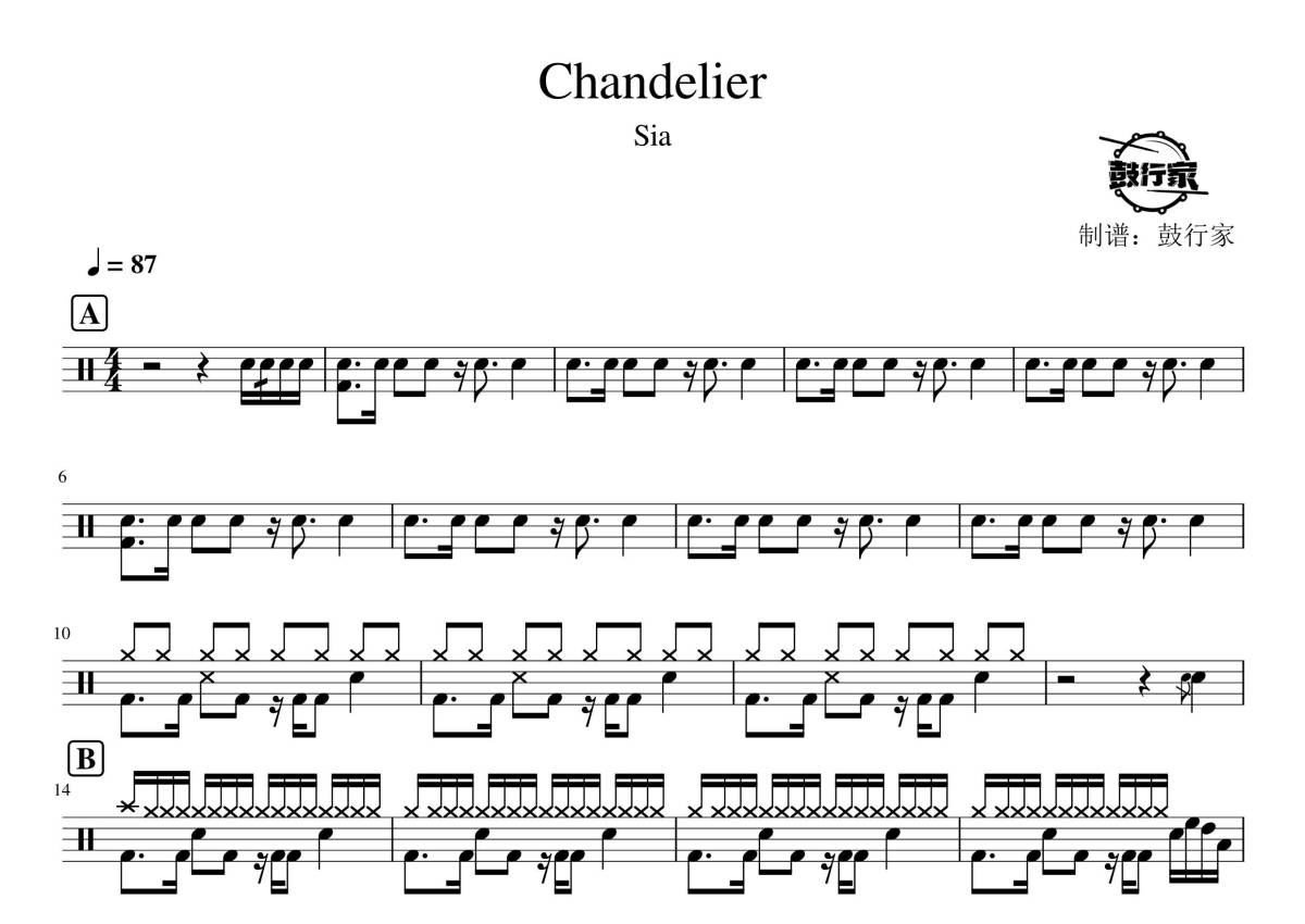 《chandelier》是Sia演唱的一首歌曲,拍号为4/4拍,歌曲速度为每分钟87拍,这份鼓谱共有两张高清图谱,图谱由 @鼓行家 编配上传,图谱使用五线谱编配,使用这份chandelier架子鼓谱,你将能够轻松地敲打出这首Sia的chandelier,快来尝试吧。