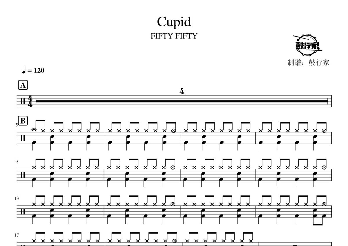 《cupid》是FIFTY FIFTY演唱的一首歌曲,拍号为4/4拍,歌曲速度为每分钟120拍,这份鼓谱共有两张高清图谱,图谱由 @鼓行家 编配上传,图谱使用五线谱编配,使用这份cupid架子鼓谱,你将能够轻松地敲打出这首FIFTY FIFTY的cupid,快来尝试吧。
