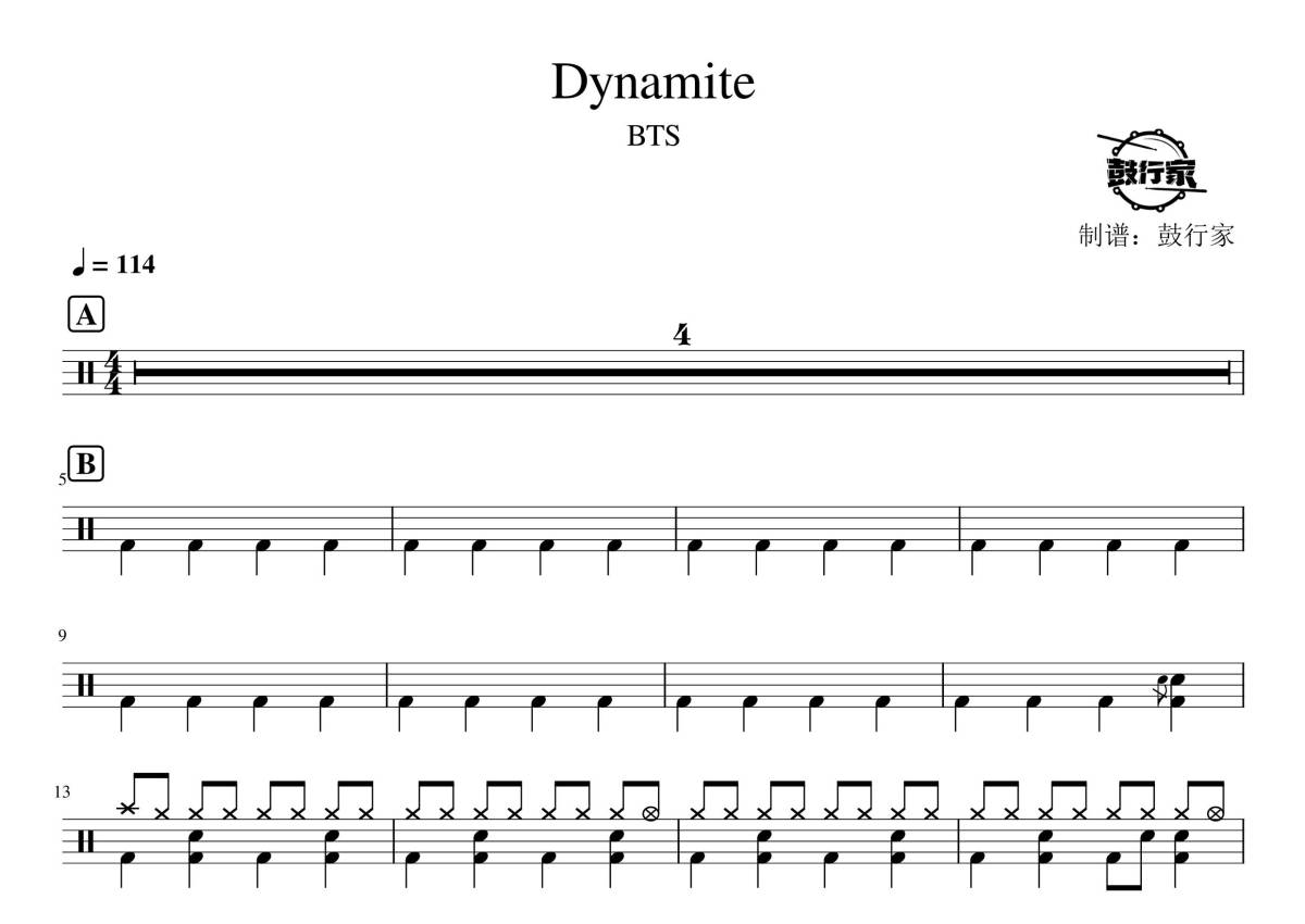 《dynamite》是BTS演唱的一首歌曲,拍号为4/4拍,歌曲速度为每分钟114拍,这份鼓谱共有两张高清图谱,图谱由 @鼓行家 编配上传,图谱使用五线谱编配,使用这份dynamite架子鼓谱,你将能够轻松地敲打出这首BTS的dynamite,快来尝试吧。