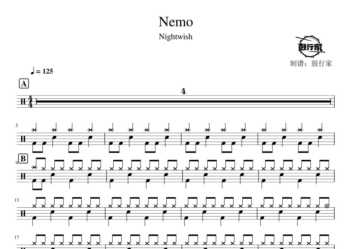 《nemo》是Nightwish演唱的一首歌曲,拍号为4/4拍,歌曲速度为每分钟125拍,这份鼓谱共有三张高清图谱,图谱由 @鼓行家 编配上传,图谱使用五线谱编配,使用这份nemo架子鼓谱,你将能够轻松地敲打出这首Nightwish的nemo,快来尝试吧。