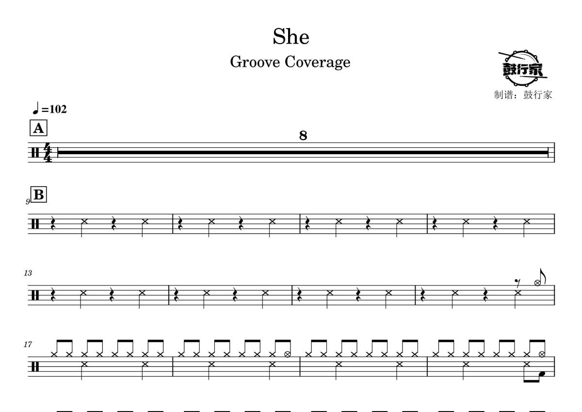 《she》是Groove Coverage演唱的一首歌曲,拍号为4/4拍,歌曲速度为每分钟102拍,这份鼓谱共有两张高清图谱,图谱由 @鼓行家 编配上传,图谱使用五线谱编配,使用这份she架子鼓谱,你将能够轻松地敲打出这首Groove Coverage的she,快来尝试吧。