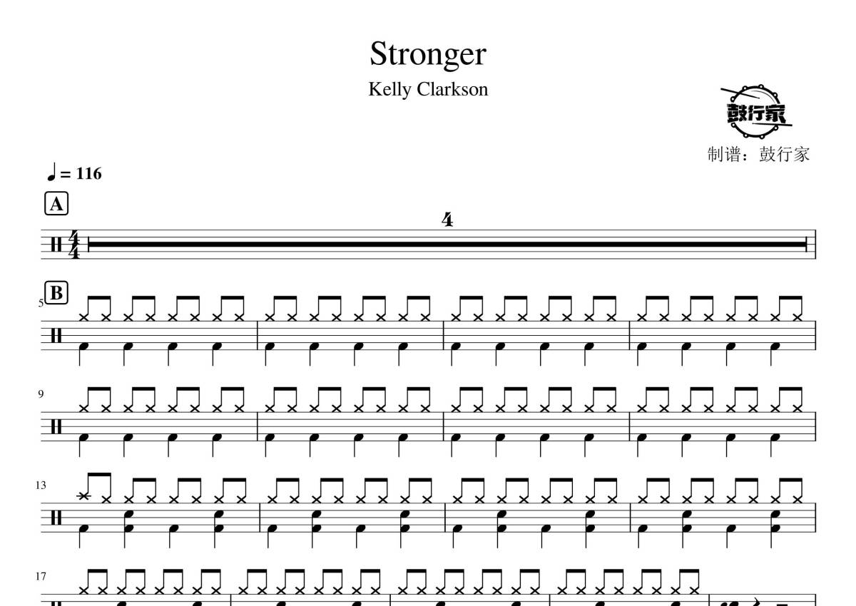 《stronger》是Kelly Clarkson演唱的一首歌曲,拍号为4/4拍,歌曲速度为每分钟116拍,这份鼓谱共有两张高清图谱,图谱由 @鼓行家 编配上传,图谱使用五线谱编配,使用这份stronger架子鼓谱,你将能够轻松地敲打出这首Kelly Clarkson的stronger,快来尝试吧。