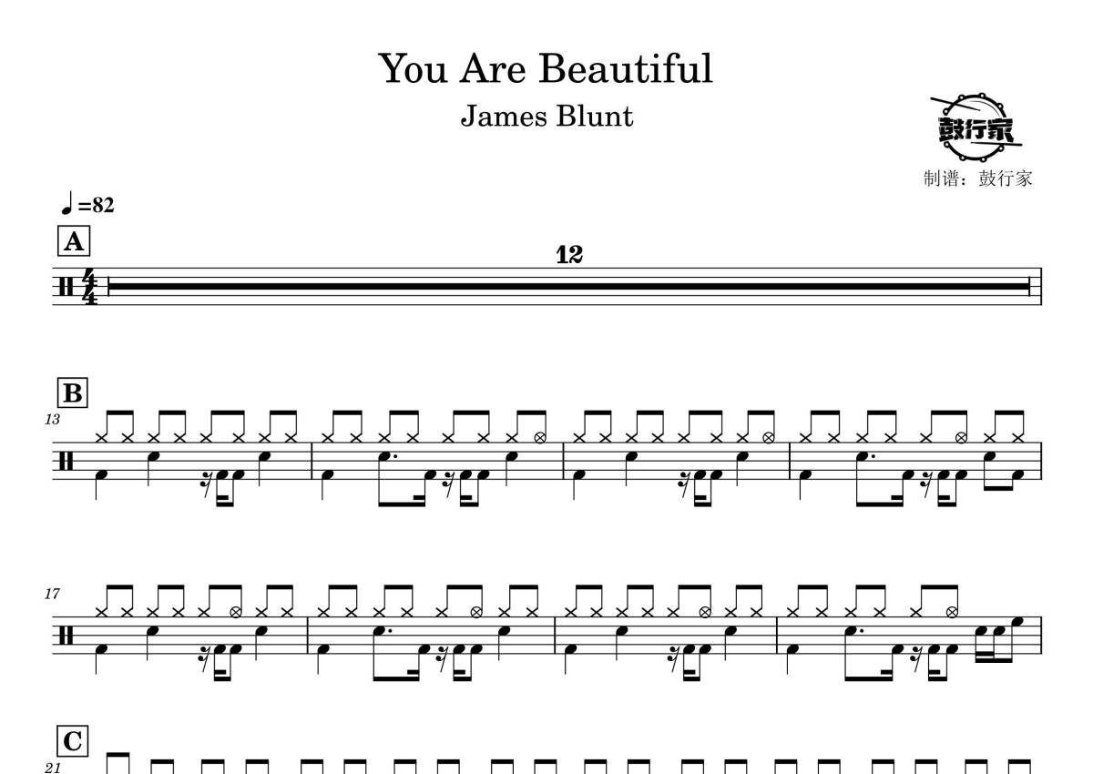 《you’re beautiful》是James Blunt演唱的一首歌曲,拍号为4/4拍,歌曲速度为每分钟82拍,这份鼓谱共有两张高清图谱,图谱由 @鼓行家 编配上传,图谱使用五线谱编配,使用这份you’re beautiful架子鼓谱,你将能够轻松地敲打出这首James Blunt的you’re beautiful,快来尝试吧。