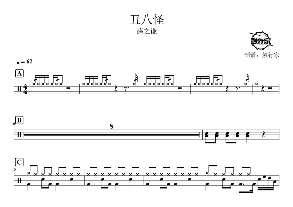 《丑八怪》是薛之谦演唱的一首歌曲,拍号为4/4拍,歌曲速度为每分钟62拍,这份鼓谱共有两张高清图谱,图谱由 @鼓行家 编配上传,图谱使用五线谱编配,使用这份丑八怪架子鼓谱,你将能够轻松地敲打出这首薛之谦的丑八怪,快来尝试吧。