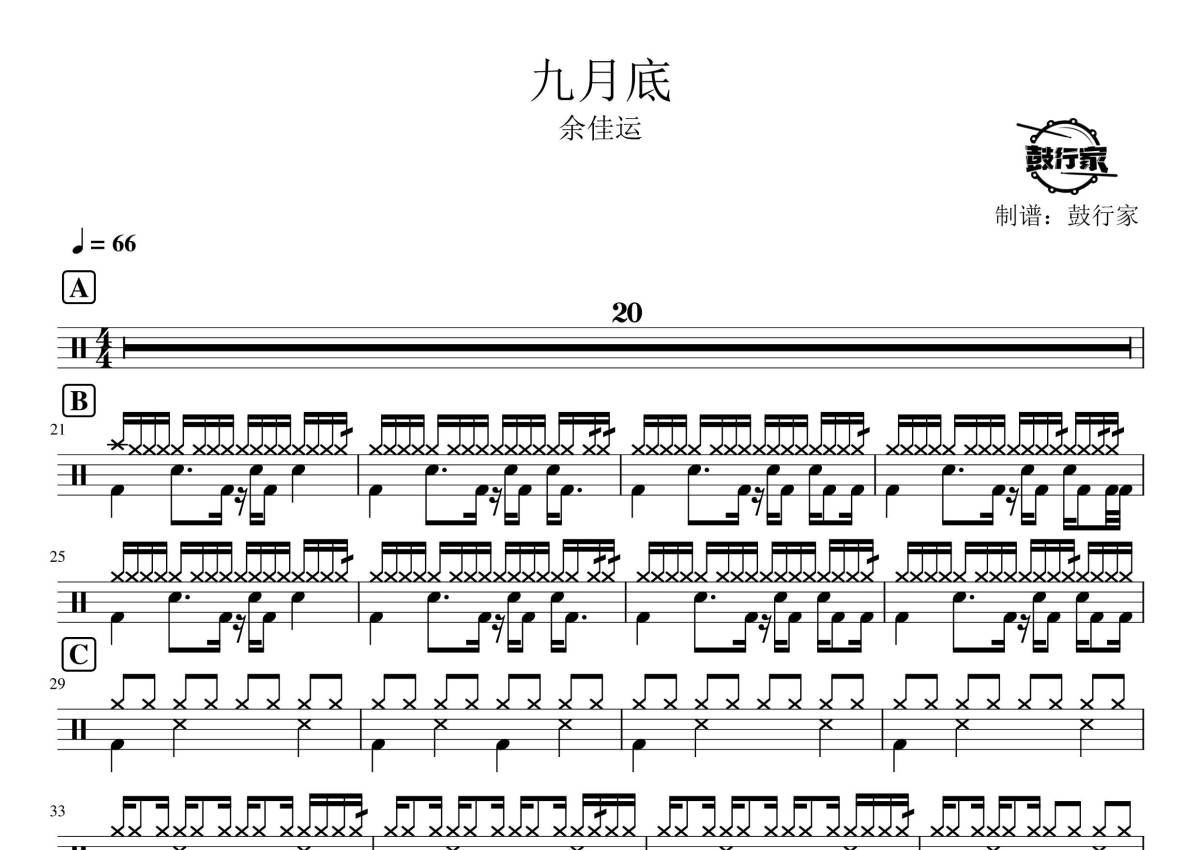 《九月底》是余佳运演唱的一首歌曲,拍号为4/4拍,歌曲速度为每分钟66拍,这份鼓谱共有一张高清图谱,图谱由 @鼓行家 编配上传,图谱使用五线谱编配,使用这份九月底架子鼓谱,你将能够轻松地敲打出这首余佳运的九月底,快来尝试吧。