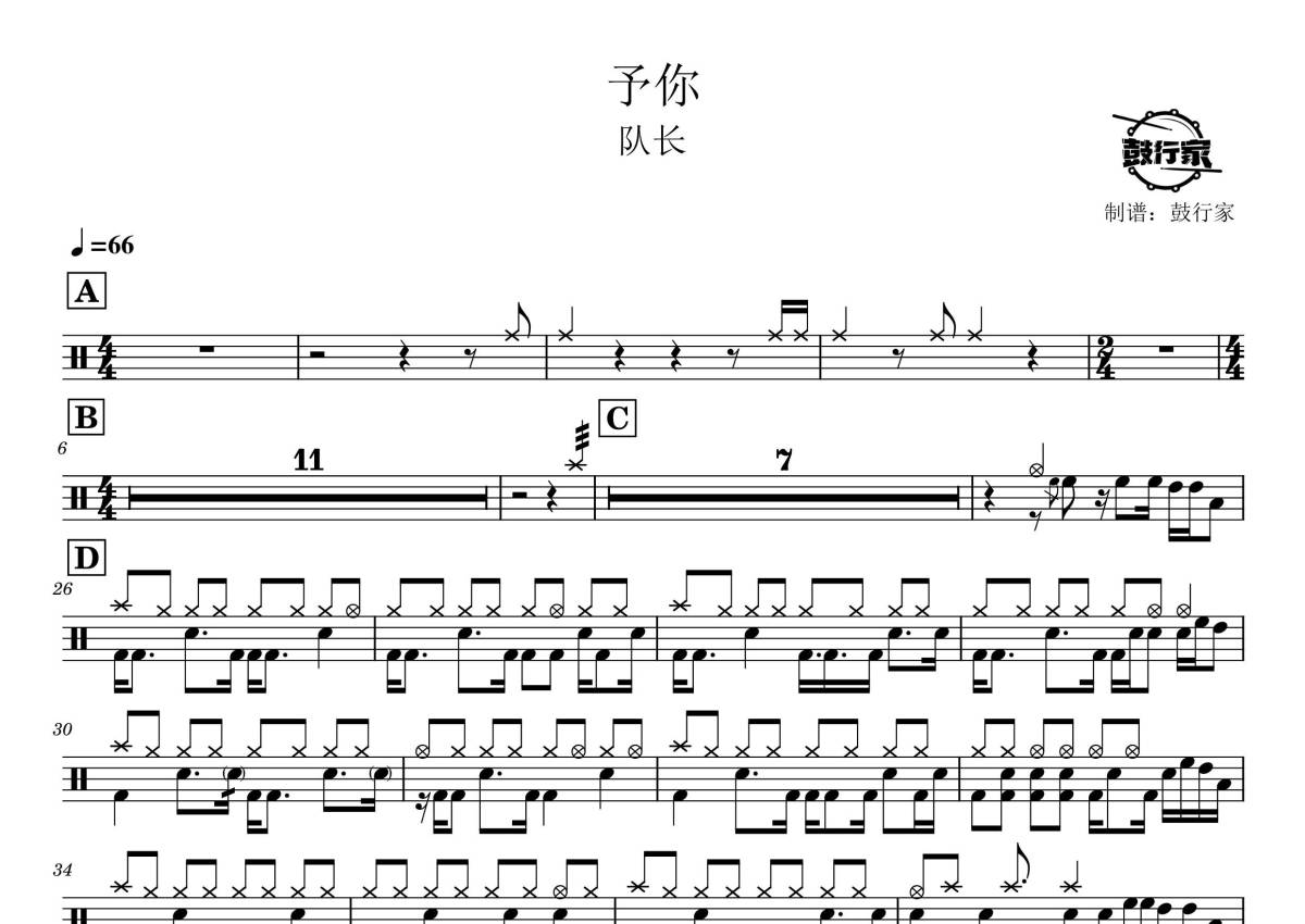 《予你》是队长演唱的一首歌曲,拍号为4/4拍,歌曲速度为每分钟66拍,这份鼓谱共有一张高清图谱,图谱由 @鼓行家 编配上传,图谱使用五线谱编配,使用这份予你架子鼓谱,你将能够轻松地敲打出这首队长的予你,快来尝试吧。
