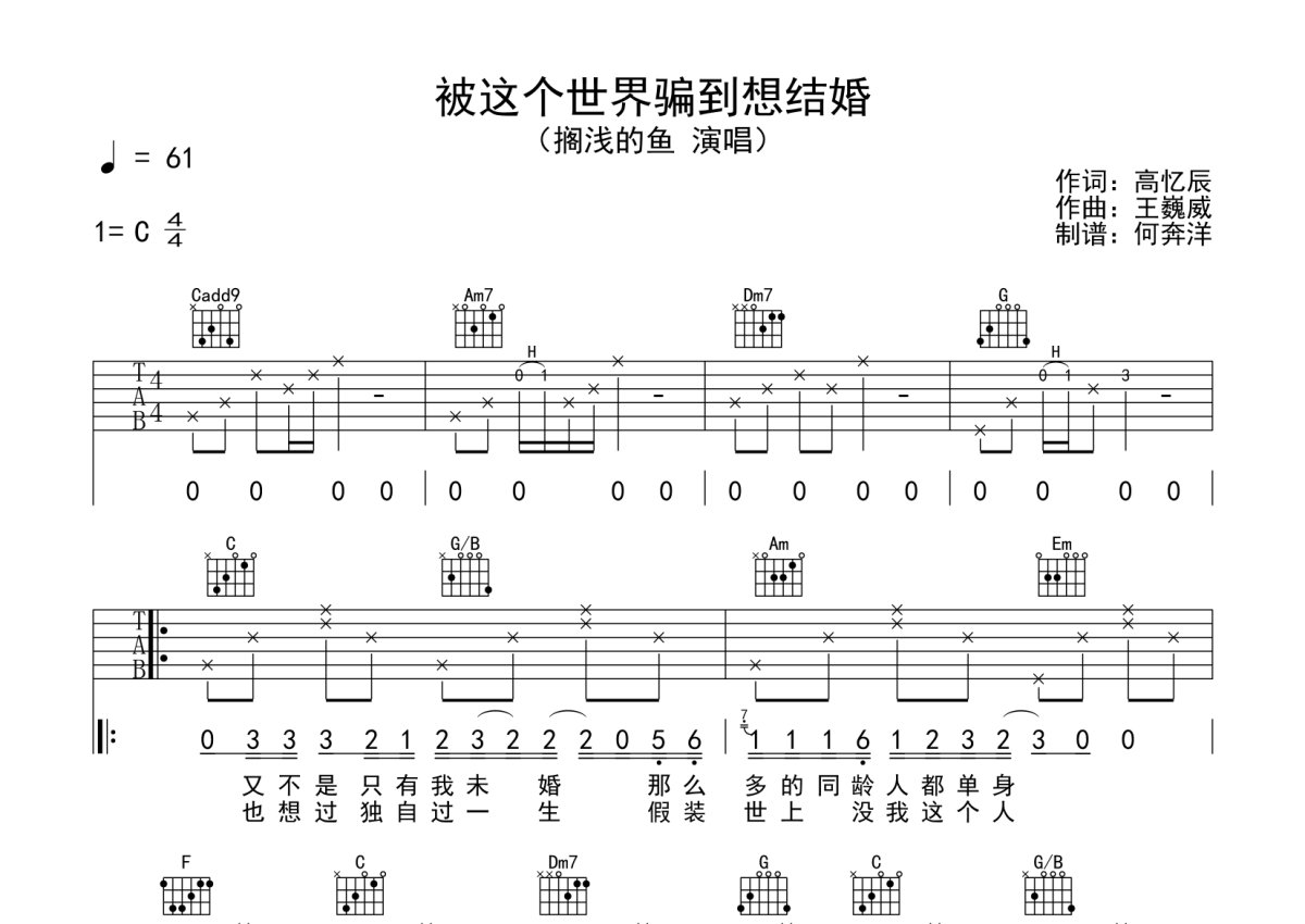 《被这个世界骗到想结婚》是搁浅的鱼演唱的一首歌曲,本吉他谱采用的是C调指法编配,这份吉他谱共有两张高清图谱,图谱由 @何奔洋 编配上传,图谱使用六线谱编配,包含吉他和弦指法、简谱以及歌词部分,曲谱配备了相关的音频提供试听,使用这份被这个世界骗到想结婚吉他谱,可以让你更加方便地掌握这首歌曲的弹唱技巧,快来尝试吧。搁浅的鱼《被这个世界骗到想结婚》吉他谱_C调吉他弹唱谱。