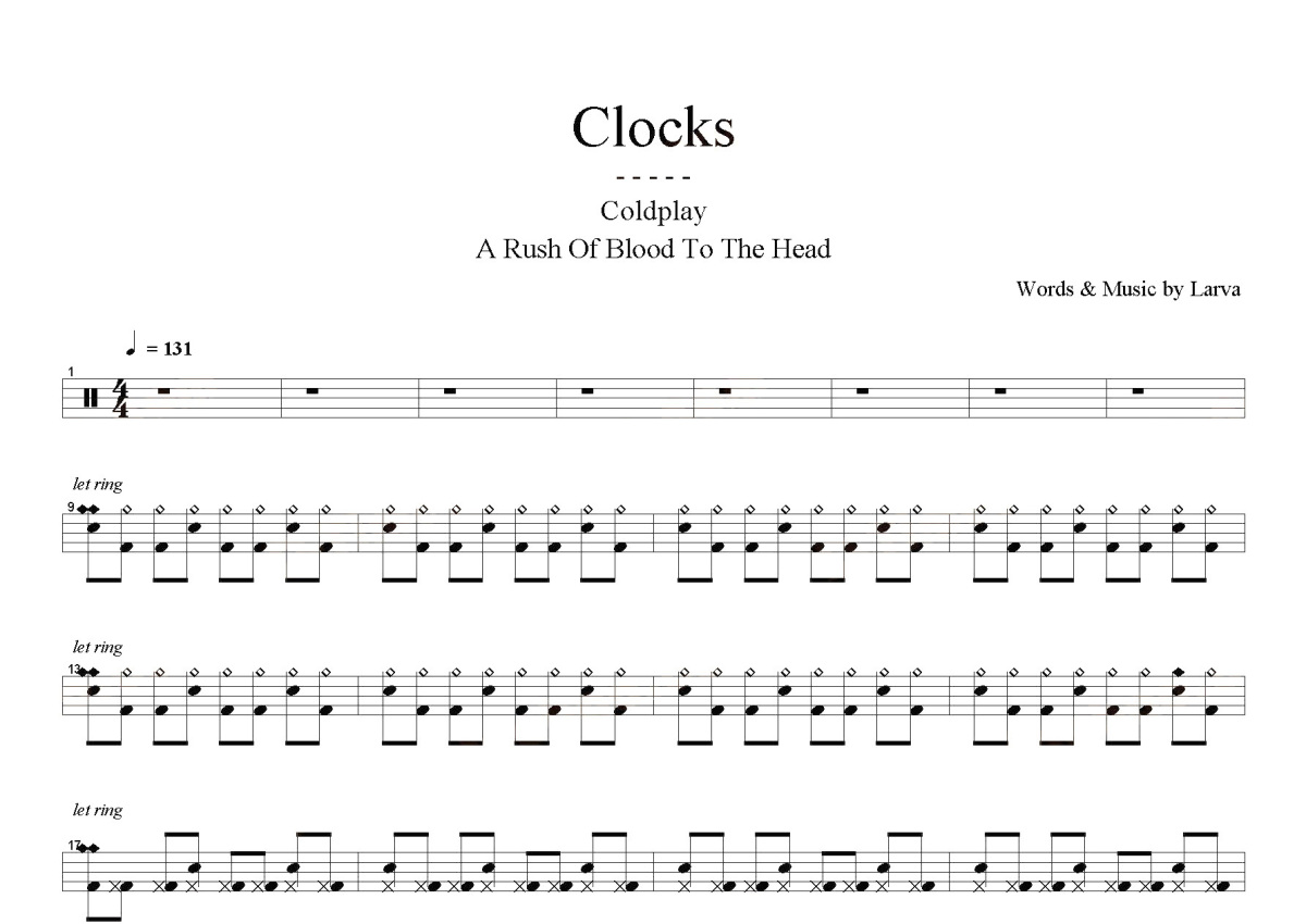 《Clocks》是Coldplay演唱的一首歌曲,这份鼓谱共有四张高清图谱,图谱由 @打鼓谱 编配上传,图谱使用五线谱编配,使用这份Clocks架子鼓谱,你将能够轻松地敲打出这首Coldplay的Clocks,快来尝试吧。《Clocks》是英国摇滚乐队酷玩乐队演唱的单曲,由酷玩乐队成员完成词曲。该曲收录在酷玩乐队于2002年8月26日发行的第二张录音室专辑《A Rush of Blood to the Head》中。酷玩乐队(Coldplay),英国摇滚乐队,1996年成立于伦敦,由主唱克里斯·马汀、贝斯手盖伊·贝瑞曼、吉他手强尼·邦蓝以及鼓手威尔·查平组成。创意总监及前经纪人菲尔·哈维通常被视作乐队的第五个成员。