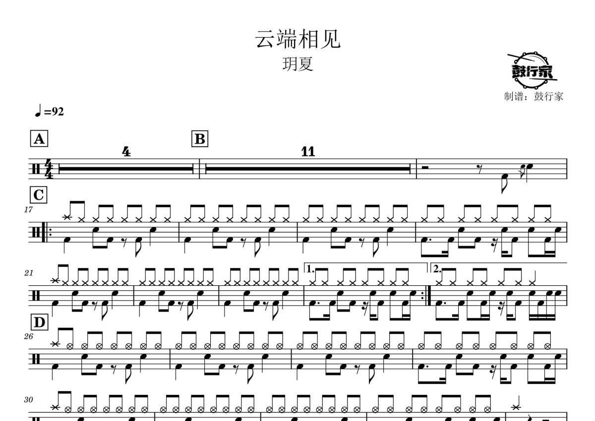《云端相见》是玥夏演唱的一首歌曲,拍号为4/4拍,歌曲速度为每分钟92拍,这份鼓谱共有一张高清图谱,图谱由 @鼓行家 编配上传,图谱使用五线谱编配,使用这份云端相见架子鼓谱,你将能够轻松地敲打出这首玥夏的云端相见,快来尝试吧。