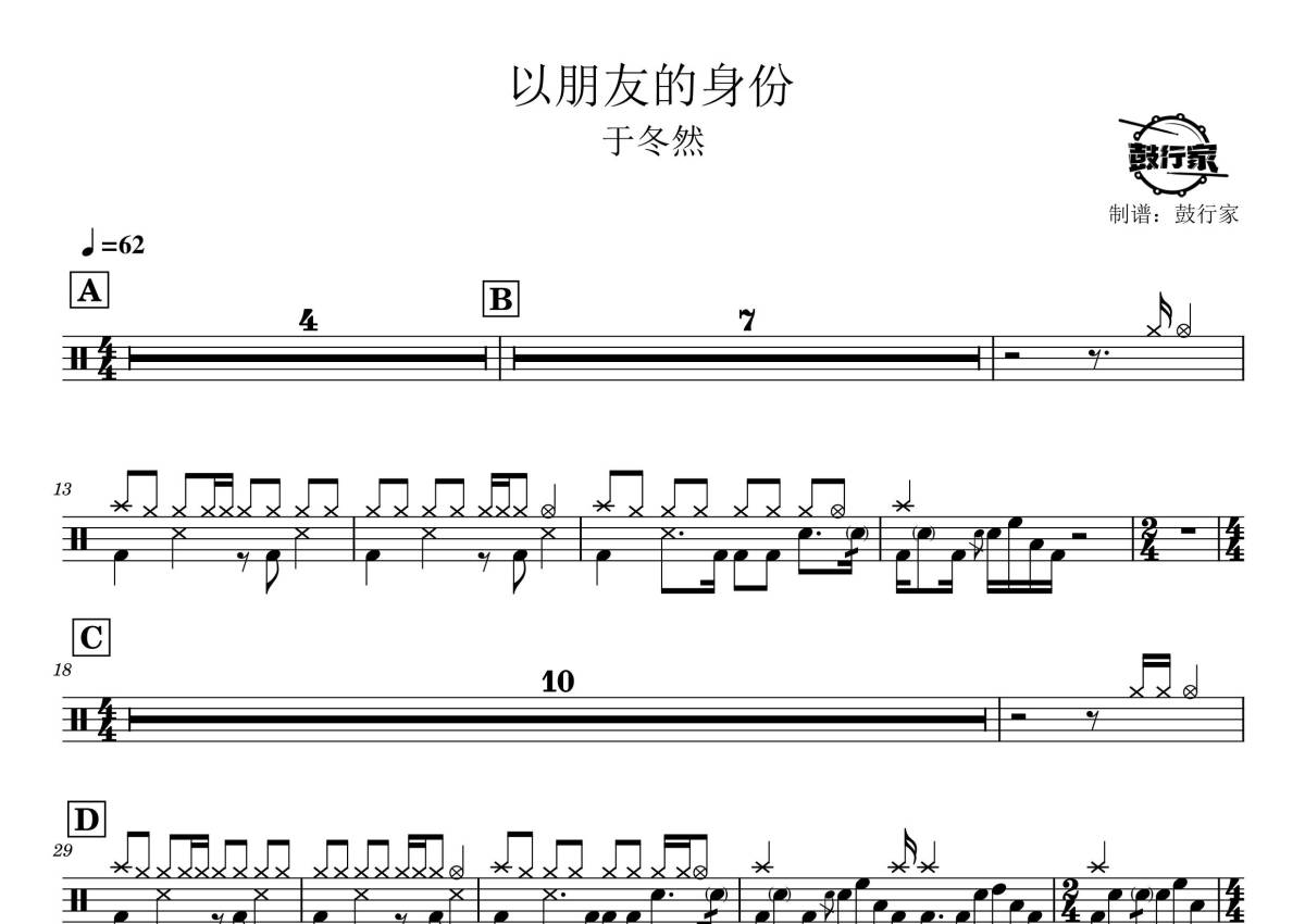 《以朋友的身份》是于冬然演唱的一首歌曲,拍号为4/4拍,歌曲速度为每分钟62拍,这份鼓谱共有一张高清图谱,图谱由 @鼓行家 编配上传,图谱使用五线谱编配,使用这份以朋友的身份架子鼓谱,你将能够轻松地敲打出这首于冬然的以朋友的身份,快来尝试吧。