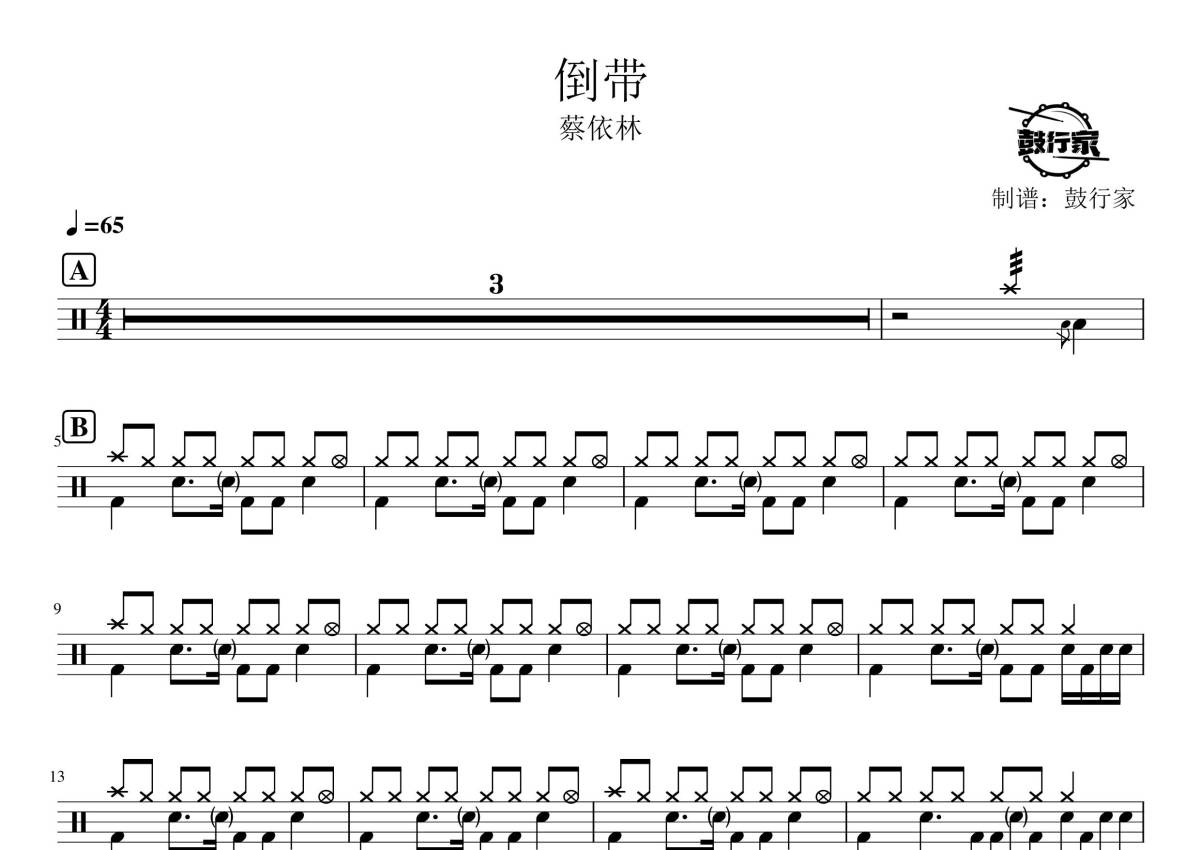 《倒带》是蔡依林演唱的一首歌曲,拍号为4/4拍,歌曲速度为每分钟65拍,这份鼓谱共有两张高清图谱,图谱由 @鼓行家 编配上传,图谱使用五线谱编配,使用这份倒带架子鼓谱,你将能够轻松地敲打出这首蔡依林的倒带,快来尝试吧。