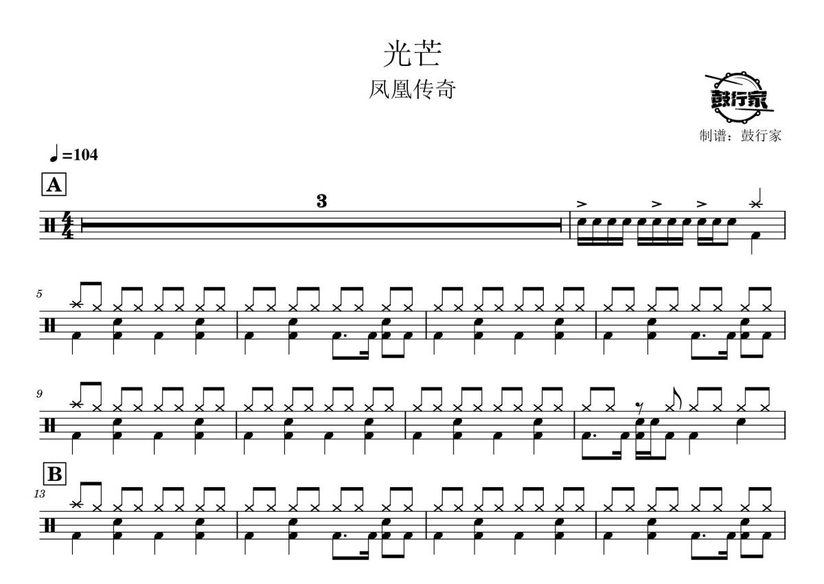 《光芒》是凤凰传奇演唱的一首歌曲,拍号为4/4拍,歌曲速度为每分钟104拍,这份鼓谱共有两张高清图谱,图谱由 @鼓行家 编配上传,图谱使用五线谱编配,使用这份光芒架子鼓谱,你将能够轻松地敲打出这首凤凰传奇的光芒,快来尝试吧。